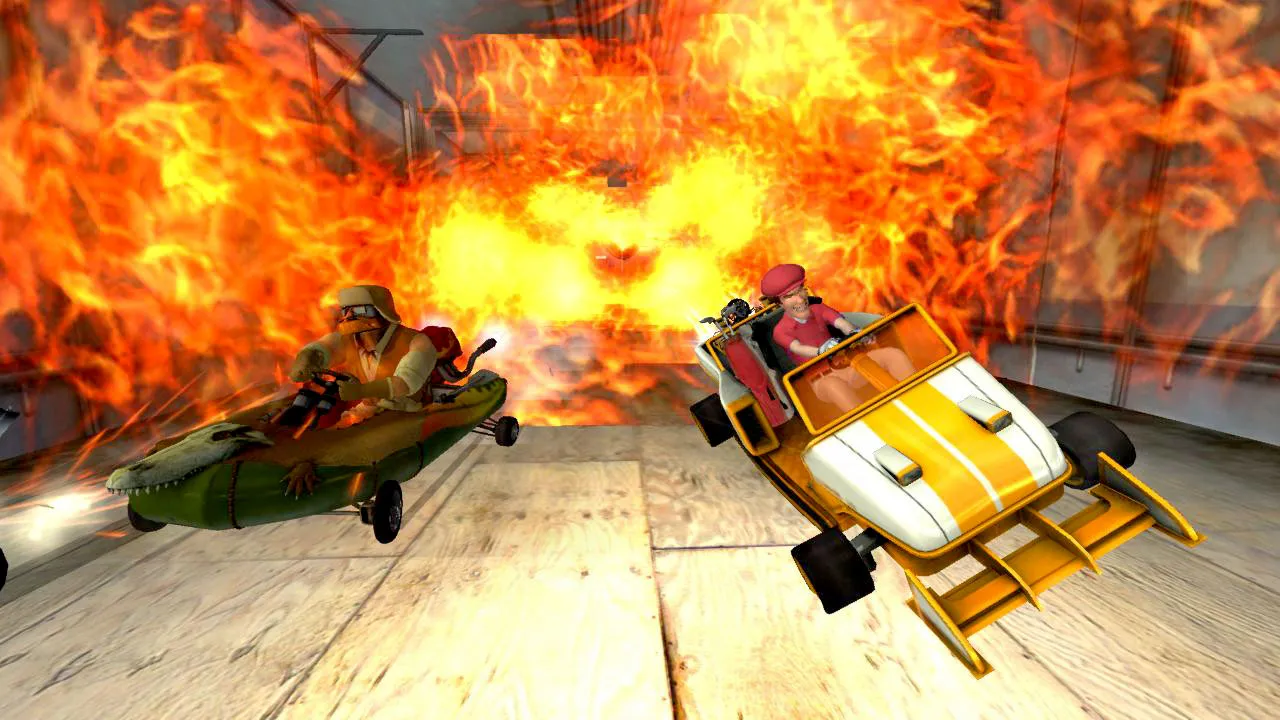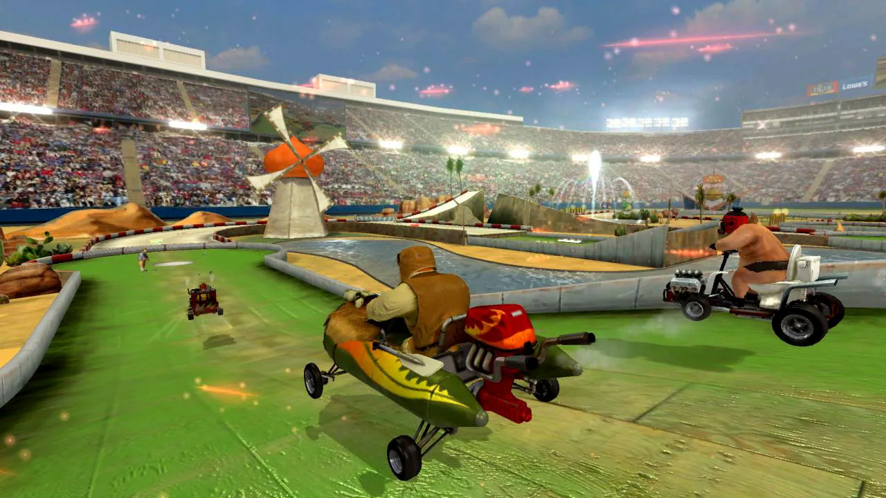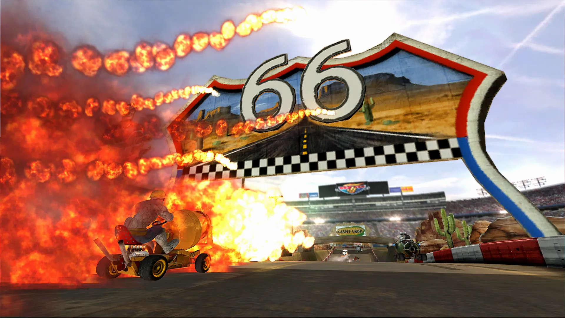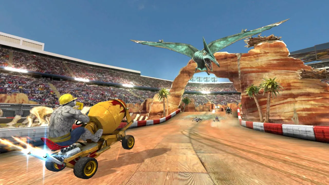The game is at its most fun when you’re simply living in the moment. It’s got a good sense of speed, and the on-track diversions are paced well. The tracks themselves have a tongue-in-check, movie set feel (like the disaster-filled Calamity City), and there’s always something to dodge, pick up, or pay attention to. You acquire and upgrade weapons during a race by driving over on-track panels, and there are also separate panels that give you fan votes (that open up track shortcuts later on) and which can activate track events to trip up competitors ahead of you.