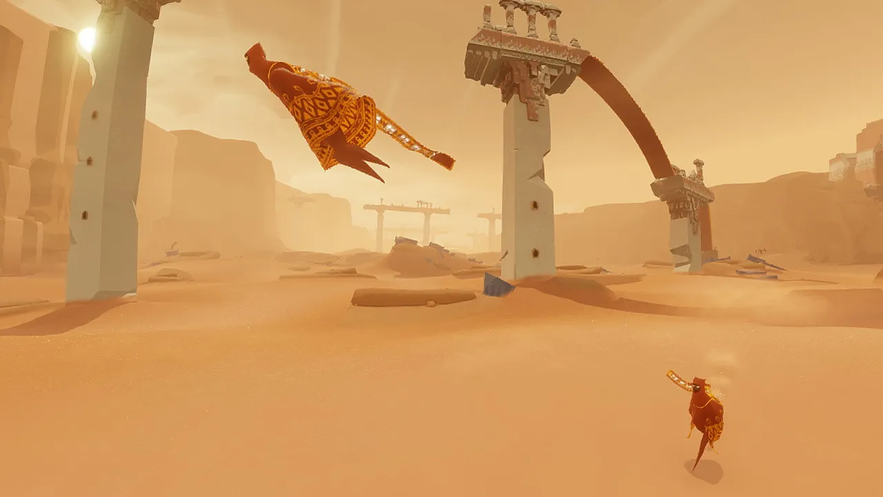 As the journey unfolds, a cryptic tale reveals both a backstory to the world and its many ruins, and some semblance of who you are and why you’re traveling to the mountain. Without words or text, this narrative remains up for interpretation through its conclusion and is likely to frustrate those looking for more concrete answers. The real story is about the places you visit as you travel and the sense of isolation the game evokes as you go.