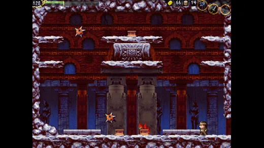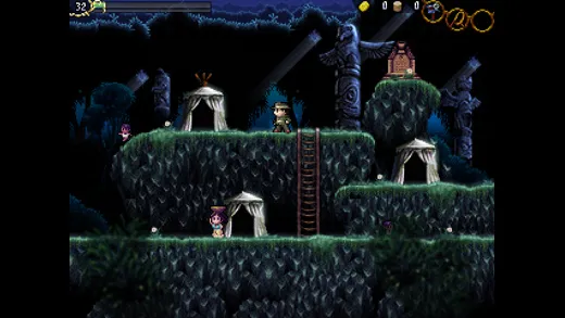 The first thing I noticed while running around was the odd approach to platforming. Lemeza can’t jump up through platforms above him, so you constantly bonk his head until you get used to it. Jumps themselves lock you into a predestined horizontal arc or a straight vertical hop. You gain mid-air control only when you start to fall after a vertical jump. All of these rules and more make me wonder why they didn’t just use standard jump controls that everyone’s used to since the days of Super Mario Bros. Practice and a double-jump upgrade help, but I could have avoided plenty of sticky situations with better controls.