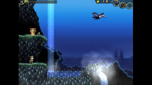 I didn’t know much about La-Mulana before going into it, and was confused right out of the gate. Despite the seemingly simple visuals, I didn’t know what to do or where to go. You control fedora-clad archaeology professor Lemeza Kosugi (an unashamed rip-off of Indiana Jones) who is summoned to the ancient ruins by his father and professional rival, Shawn. I must not be the only confused one out there, as Nigoro has posted a handy “beginner’s guide” video and online manual that set up the basic controls of the game, tell you how to save, and offer a basic warning about how much you will die. This should have been incorporated into the game itself, but it sets the precedent for a complete lack of handholding.