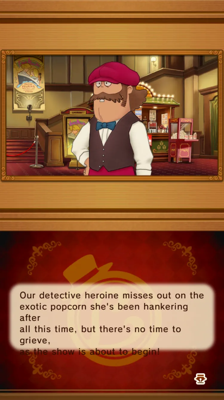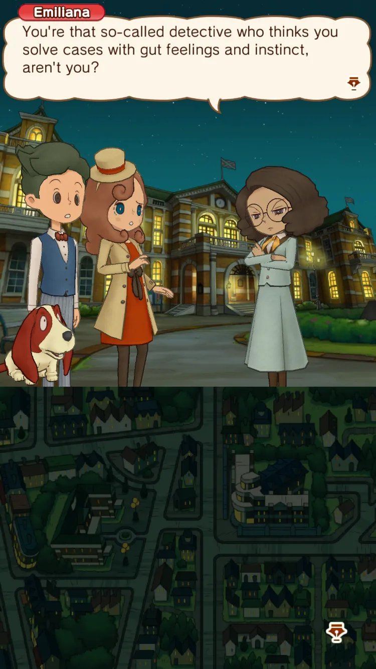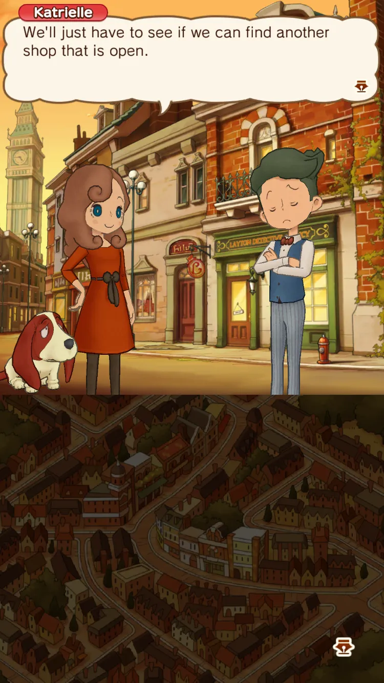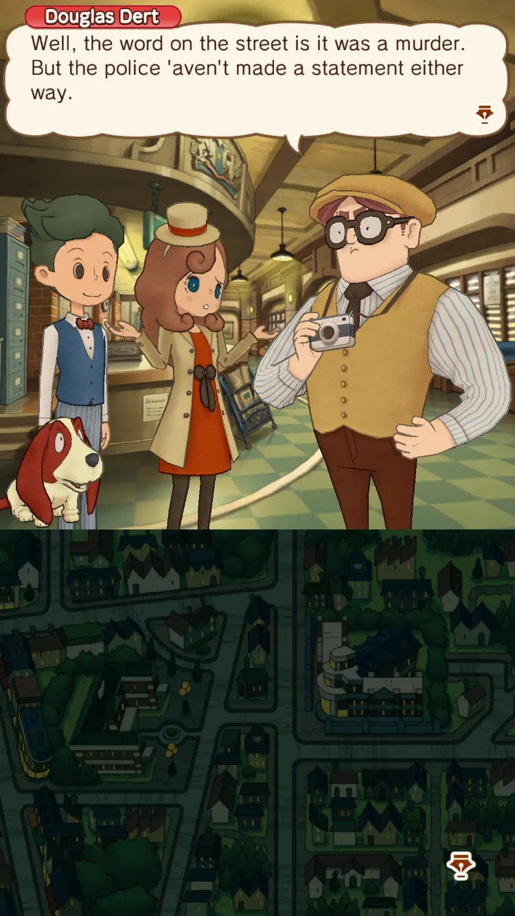 Katrielle is bright, funny, and more interesting than her dad in every way. Admiring Professor Layton’s intellect and poise is easy, but I had much more fun with Katrielle and her joyful approach to puzzle solving (and her seemingly bottomless stomach). Her assistant, Ernest Greeves, has a secret crush on her, and it is not surprising in the least. Katrielle is a highlight, but her story is over-long and doesn’t offer much incentive to see it through.
