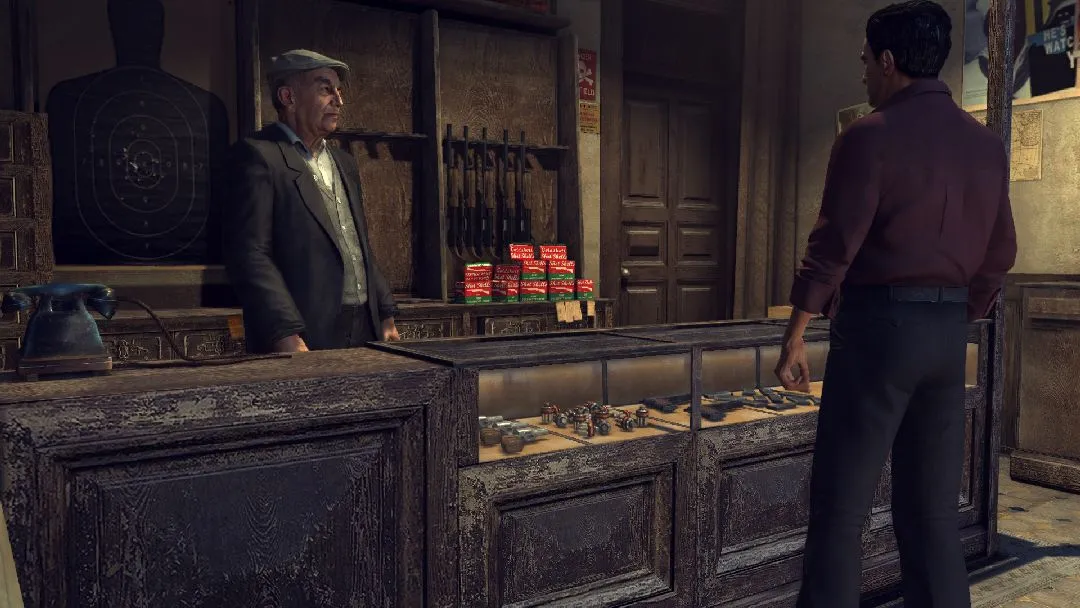 The telephone rings and we walk over to pick it up. It's Vito's best friend and partner in crime Joe Barbaro, who relays the spot to meet for the hit. Before we head over to kill in the name of Don Clemente, I decide to take the car for a joy ride and check out the open world sandbox. Mafia II has three radio stations playing hits from the times; I stick with the channel playing Buddy Holly. The city is bustling with activity -- cops walk their beats, pedestrians go about their business, and visitable businesses are scattered throughout the area. I start by paying a guy in a park $1 to shine Vito's shoes, then visit a diner, body shop, clothing store, gun dealer, and gas station. The cars in Mafia II have a gas meter, and I don't want to be running on empty in the middle of a police chase.