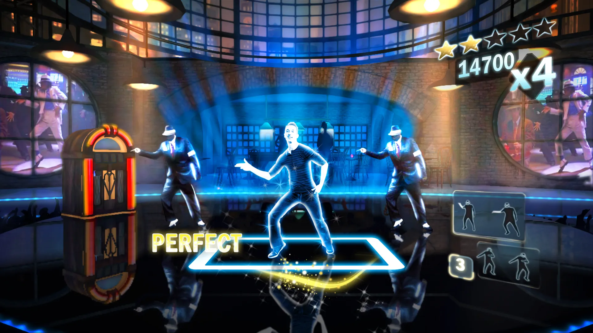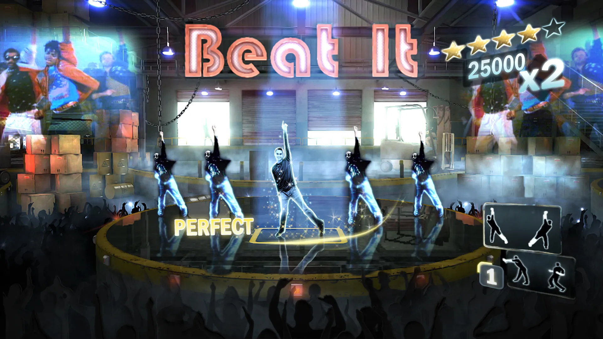 Michael Jackson The Experience projects a fluid outline of your likeness on a variety of performance stages designed after each song's respective music video. Players step along a lit up sidewalk in "Billie Jean" and jam among undead backup dancers in "Thriller." All of the tracks are available at the outset, allowing you to sing, dance, or both.
