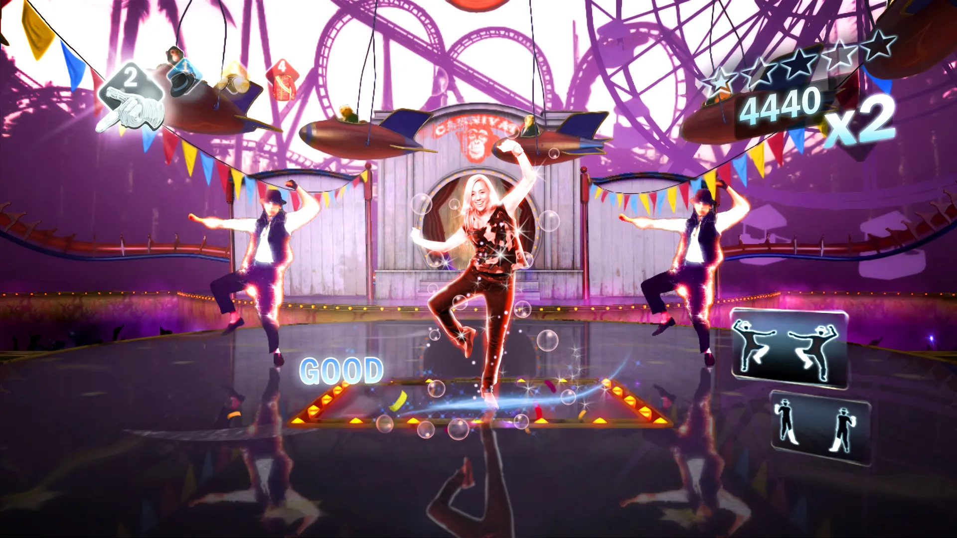 These flaws hamper the single player, but in co-op The Experience shines. After selecting a track, up to four players can join in on the performance. Each player is randomly selected to complete a segment of a song, and roles of singers and dancers are constantly shaken up so you never know what to expect. Unfortunately, I can't say the same about versus mode. Here two teams compete for a high score, but it lacks the frantic spontaneity that makes co-op so entertaining. Instead you are forced to listen to the selected song twice, as you and your opponent perform the same routine one after the other.