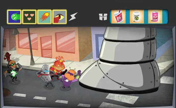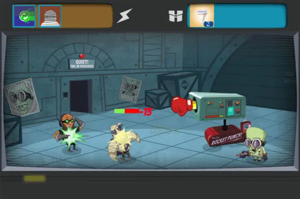 The majority of the missions in the game are battles with criminals and henchmen. Players can bring four of their superheroes into combat at a time, controlling the use of purchased items (such as healing and temporary stat increases) and the deployment of special moves that refill over time. These special moves can be purchased and leveled up at the base, each hero is allowed to bring one into battle. Characters can purchase and equip items that improve their performance in battle, like "Titanium Oven Mitts" to improve their power and bubble-wrap to improve their defense. Each fight gets you one step closer to facing off against an evil villain. Defeating them earns you a large amount of Superium and you move on to the next villain. Combat is simple in the first couple of hours and doesn't require strategy outside of tapping on your special abilities whenever they are available while your heroes auto-attack, but mixing and matching the special abilities of a full team might lead to more strategic battles further on.