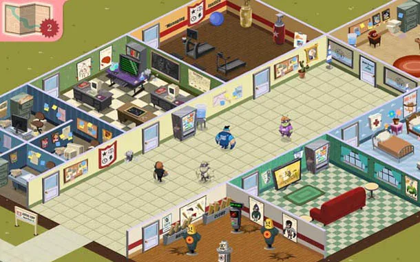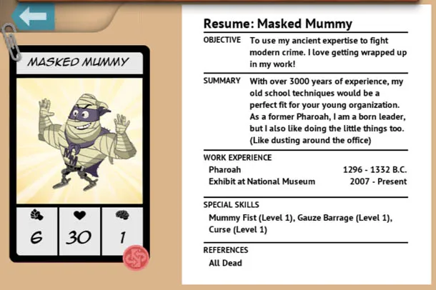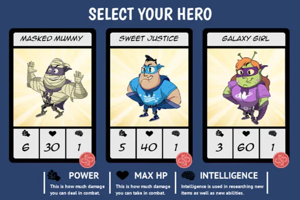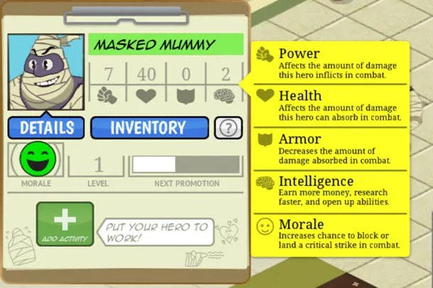 Playing the role of a character known only as "Middle Manager", your job is to recruit and train superheroes as you expand your base of operations. The superheroes are all quirky, original characters like "Masked Mummy" and "@Man", a hero obsessed with both social media and laser beams. You start the game by recruiting one of three characters and purchase more as you advance, unlocking alternate costumes along the way. Characters vary in power, health, and intelligence, stats which increase through training each time they level up or (in the case of intelligence) by direct intervention from the middle manager. By sending your team on missions that vary from battles to feats of strength, you earn one of the game's two forms of currency: coins and Superium. Coins are easier to acquire and can purchase new items, equipment, or additions for your base. Superium is used to speed up timed tasks and recruit additional heroes.