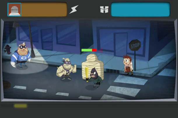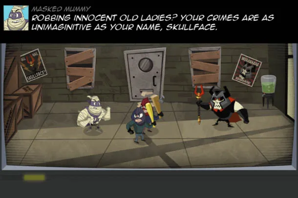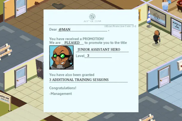 The highlight of the game is the presentation. The art style is reminiscent of old Looney Tunes cartoons and creates a cohesive world for these bizarre and varied superheroes. Playing underneath the ambient office sounds is a subtle musical score that flirts with classic Superman themes while perfectly complimenting the cartoon aesthetic. The light-hearted nature of the world is conveyed through a surprising amount of text dialogue and character descriptions. Each battle begins and ends with a joke-filled exchange between the forces of good and evil, which help define the personalities of your superheroes but can be a hassle to tap through when forced to replay a particularly tough fight.