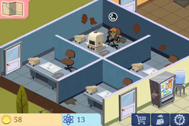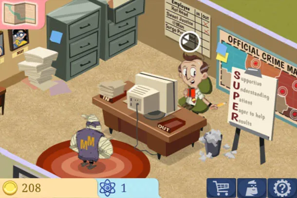 Middle Manager of Justice is also Double Fine's first free-to-play title, an inviting genre that is often as much a curse as it is a blessing. The good news is that (at least in the early hours) the game's micro-transactions are relatively tucked away and won't annoy players with frequent pay-walls. While you are welcome to use real money to purchase Superium to convert into coins or to speed up the recruitment of advanced superheroes, the game offers a wealth of content with no strings attached. The linear progression of the missions from district to district on a map and the inability to grind past missions for coins opens up the opportunity for future missions to cost real money, but the only hint of this on the map is a few off-limit areas labeled "coming soon". All of the actions in the early portions of the game (such as having the middle manager increase the morale of characters, or letting your heroes regain their health by sleeping) take under a minute to complete, so the option to speed things up using precious Superium is rarely tempting. Unlike other simulation games like Tiny Tower that are best played by briefly checking in several times a day, Middle Manager of Justice's addictive trickle of progression can be played for long stretches of time.