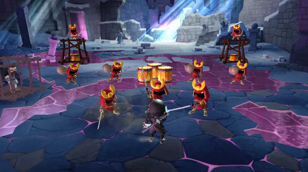 Check out the screens in the gallery below to see the diminutive heroes kicking evil samurai and...barrels. Players can battle the bad guys with gesture-based controls and upgrade their heroes.