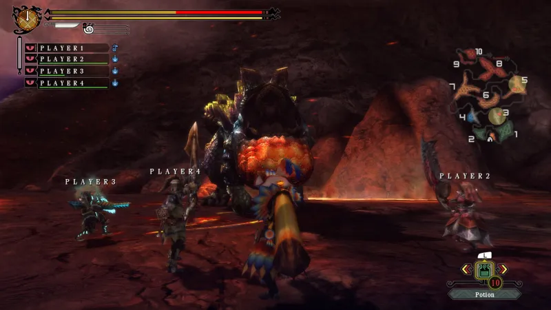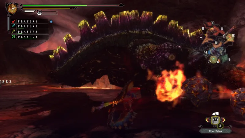 My fellow 3DS-wielding adventurer and I eventually meet up at the quest bulletin board. He’s posted a mission, which I accept. We’re hunting a gigantic dragon across the wiles. Venturing forth into the next zone, we immediately stumble upon a gigantic red dragon. The beast spits fireballs, flails its massive tail, and flies around the environment when we engage it in battle. A new targeting feature allows me to keep the camera fixed on the creature as it soars out of view (especially useful on the 3DS). My ally and I lay gigantic bear traps and sinkhole hazards to impede the creature. We focus our attacks on the tail, eventually severing the appendage and negating one of its attacks. The dragon begins limping and drooling, indicating that it’s fighting spirit is waning. The dragon sulks off to another zone, and we take the opportunity to cut some scales off its severed tail, which may be useful for crafting later.