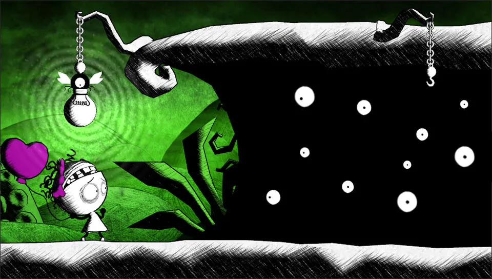 The visuals are striking, with cross-hatched pencil art and unique characters. Baby, the heroine, is essentially a stick figure with an oversized, upside-down head. As she journeys through this surreal adventure, she encounters equally bizarre creatures, most of which are out to get her or her balloon. Whether you think it’s cute or grotesque probably depends on how closely you identify with Jack Skellington.
