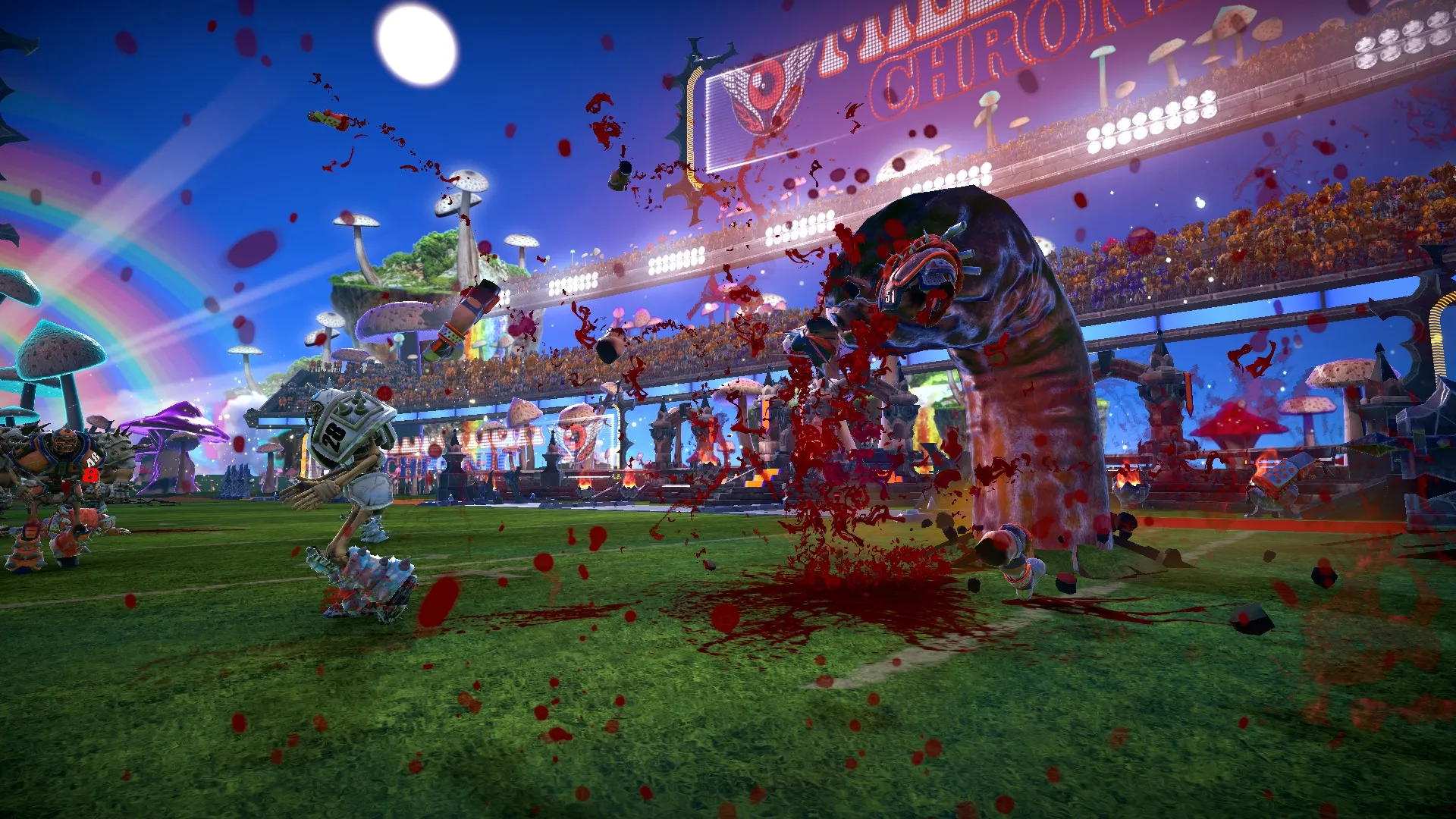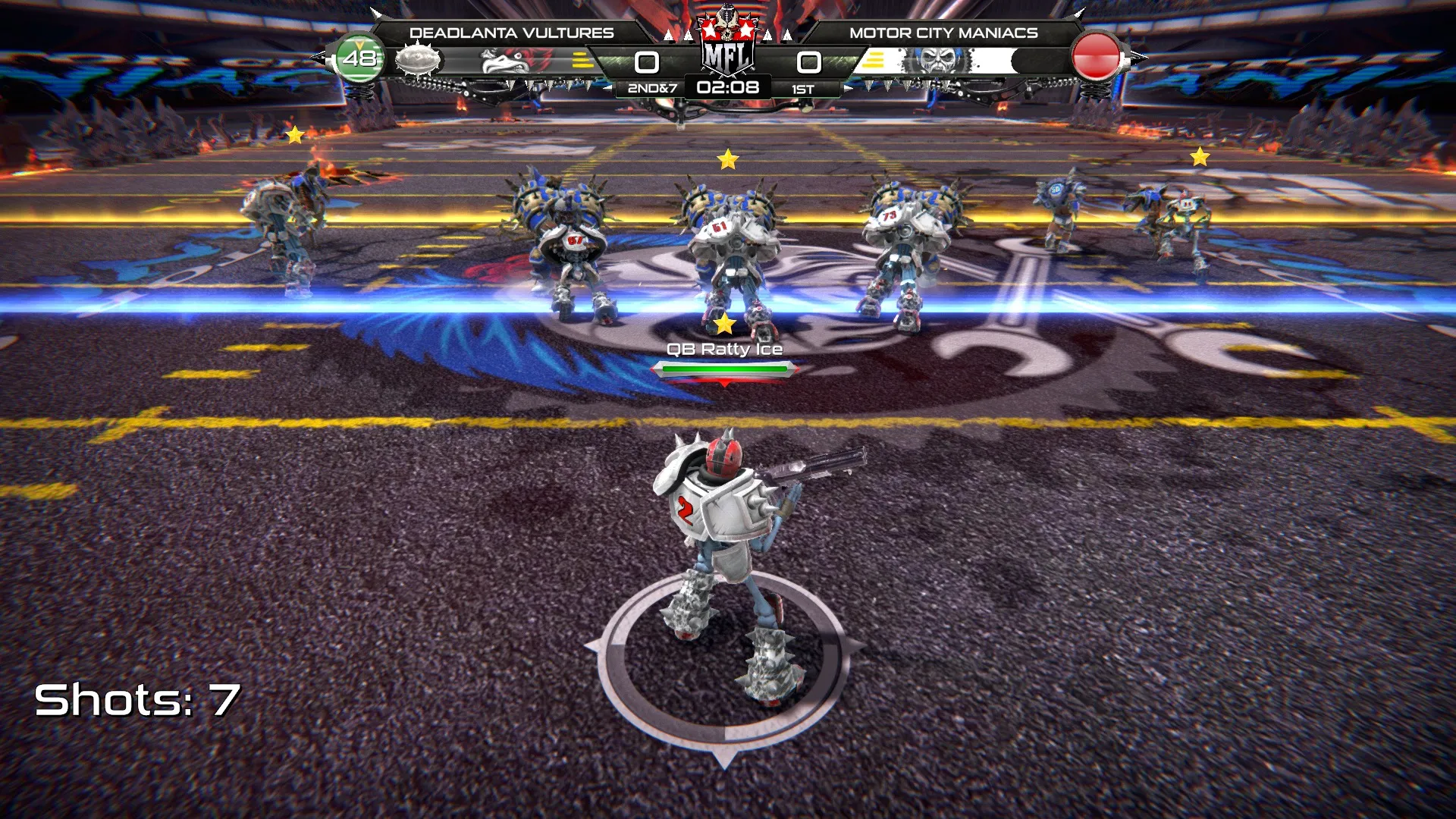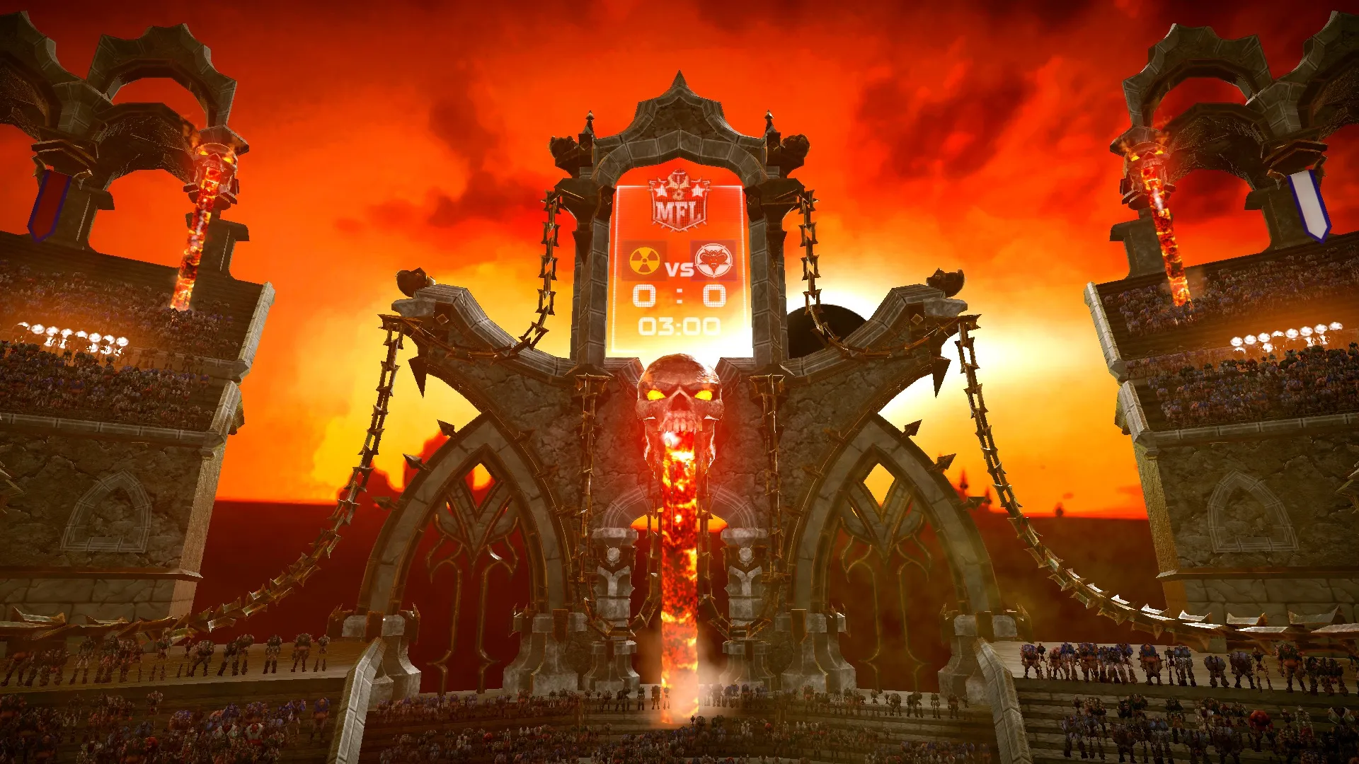 A spiritual successor to the infamous EA series Mutant League Football, MFL faithfully preserves the elements that made the original a best seller. The favored bloodsport of a post-apocalyptic culture pits ragtag groups of trolls, aliens, robots, mutants, and skeletons against each other on a hazard-filled gridiron with the goal of outscoring (or outkilling) each other. Ref bribery, late hits, quarterback dismemberment, and even ref executions are all fair game. Teams and players have Garbage Pail Kids-style parody names like the Nuked London Hatriots (New England Patriots) and Bomb Shady (Tom Brady). Some of the cleverer names elicit a chuckle, but the majority produce groans.