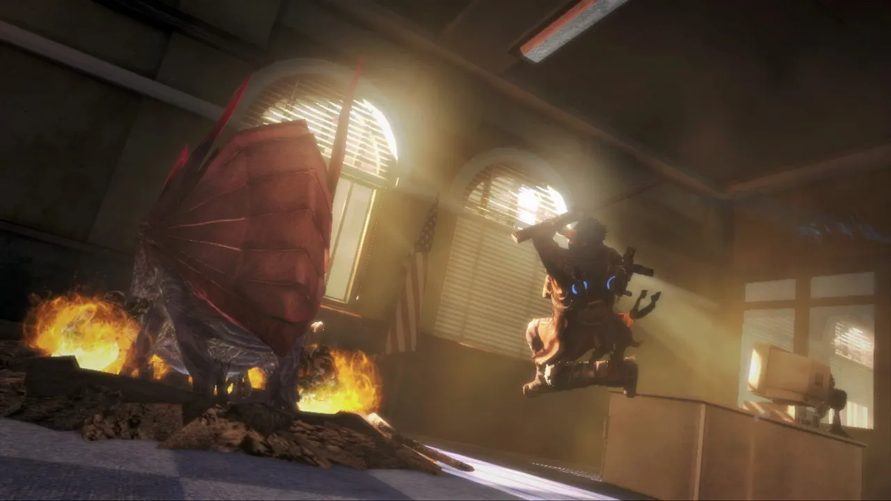 This is even more difficult when the camera wigs out and you can’t tell where you are. The boss battles, which are long, multi-stage wars of attrition, rarely offer anything more creative than “shoot him in the glowing part” and feature such annoying tropes as regenerating health bars. Even worse, a few times I encountered bugs like my severed head rolling through the floor into a weird, blank dimension with only a city skyline and another, more serious bug that left me cut off from the last enemy I needed to kill to advance through the next door.