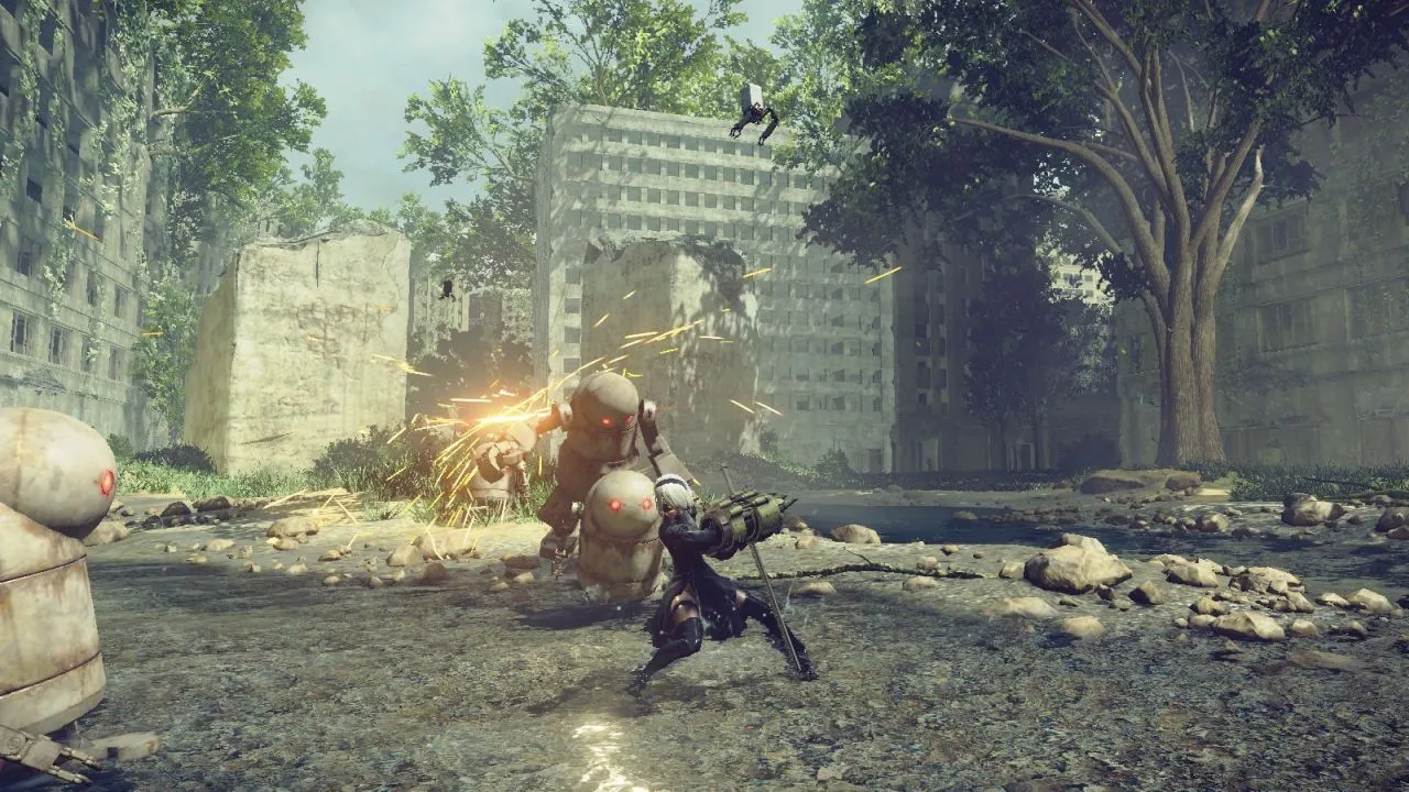 In Nier: Automata, mechanical enemies have overrun Earth. Humans have left the planet, outside of The Resistance, a group of humans who stayed behind to fight off the robotic enemies. You play as 2B and her companion 9S, both of whom are androids that are aiding the humans to fight off the hostiles.