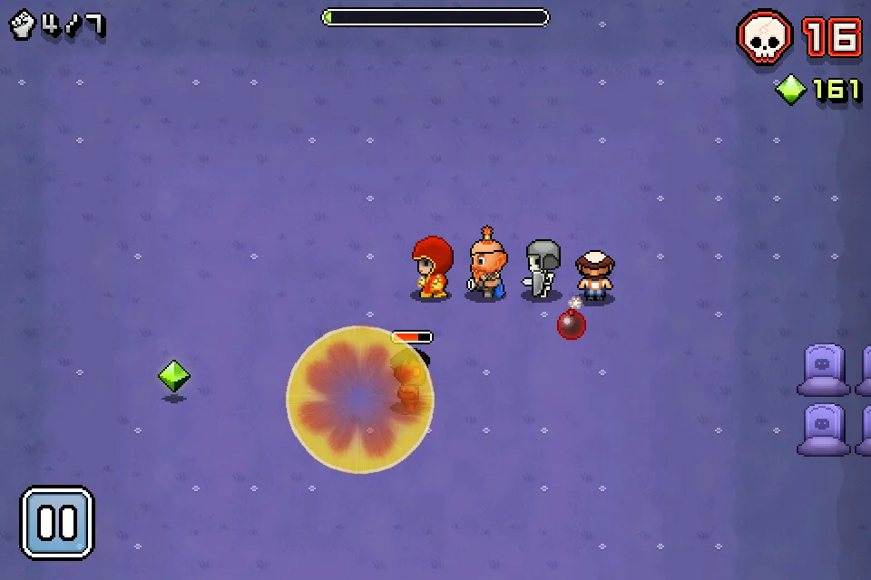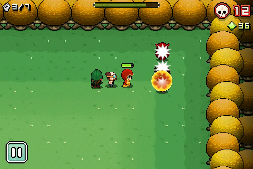 The concept is simple: You select one hero who moves in four directions around a series of enclosed arenas, defeating enemies and picking up other heroes along the way. They follow you, and the whole party snakes along, automatically firing off powers at passing monsters as you swipe the screen to steer them away from obstacles. Between rounds, you power up your heroes and spend gems to upgrade the temporary bonuses you pick up on the battlefield. The easy-to-control action provides mild entertainment, but it does not lead to success.
