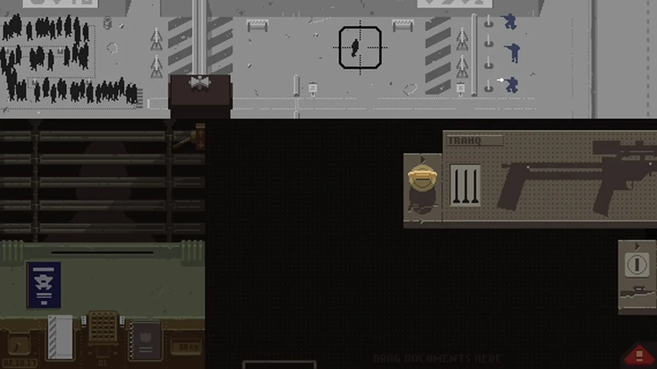 Terrorists occasionally attack the border guards in bloody acts of political unrest, which is where my favorite gameplay mechanic comes into play. Early on, acts of sabotage shut down the checkpoint, robbing you of the rest of the day’s potential income. Later you’re bestowed with the duty of firing tranquilizer darts at would-be assassins. The gun is locked behind a special box that only appears when the alarm sounds. I placed the gun locker’s key in a special spot on my desk, so I knew where it was when it came time to drag it over, unlock the gun, and take aim. Gunning down insurgents comes with a decent cash bonus, which becomes necessary for recompensing lost wages from the lockdown. Hearing the alarm in the midst of your routine is shocking and exciting. I love the sense of duty and reward patrolling the nation’s unpredictable border comes with.