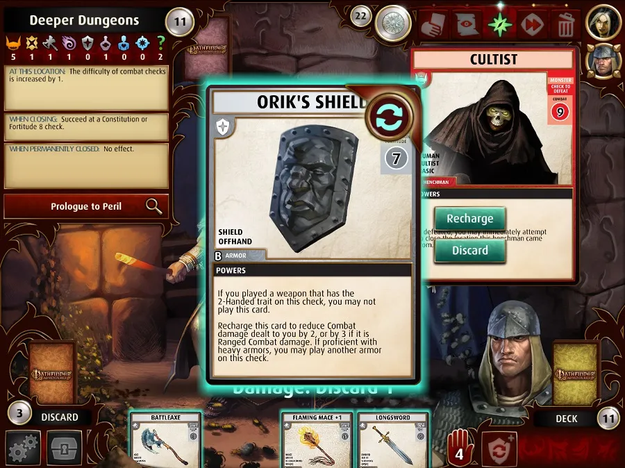 Fans of the Pathfinder Adventure Card Game will feel right at home with Obsidian’s mobile title. It’s a very accurate port of the tabletop game’s experience. Players guide a party through various locales to corner and defeat what is essentially a boss character, taking down henchmen and picking up loot along the way. As items, weapon, armor, allies, and spells are picked up, they’re added to the character’s deck. These cards are then used to modify checks on character statistics like their dexterity, wisdom and strength. So, for example, a mace can be used to add an extra D6 to a character’s strength check against an enemy, and a lockpick might add a +1 boost to your character’s dexterity check.