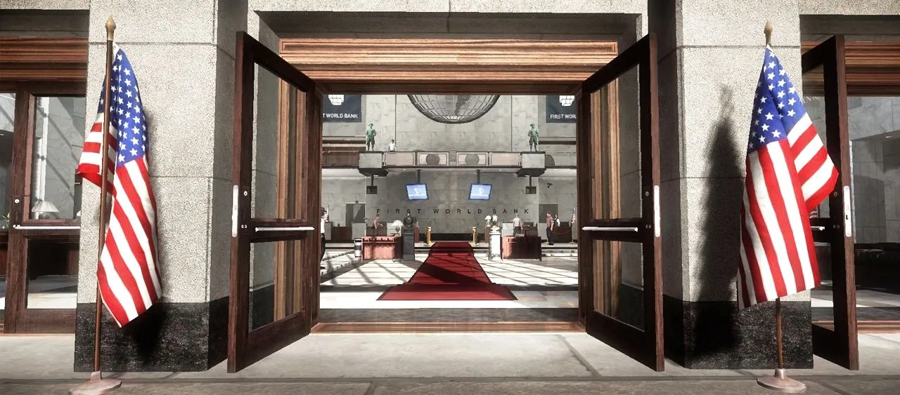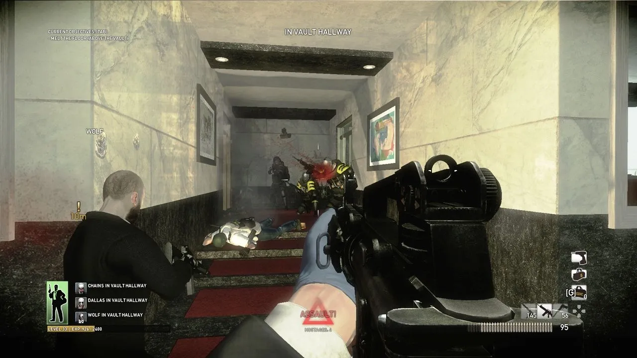 In the bank robbery I played at E3, all four players start by casually strolling into the bank to be robbed with weapons under their business suits. Once you’ve sufficiently cased the joint, you throw on your masks and start shooting. The alarm sounds, civilians start screaming, and the action starts.