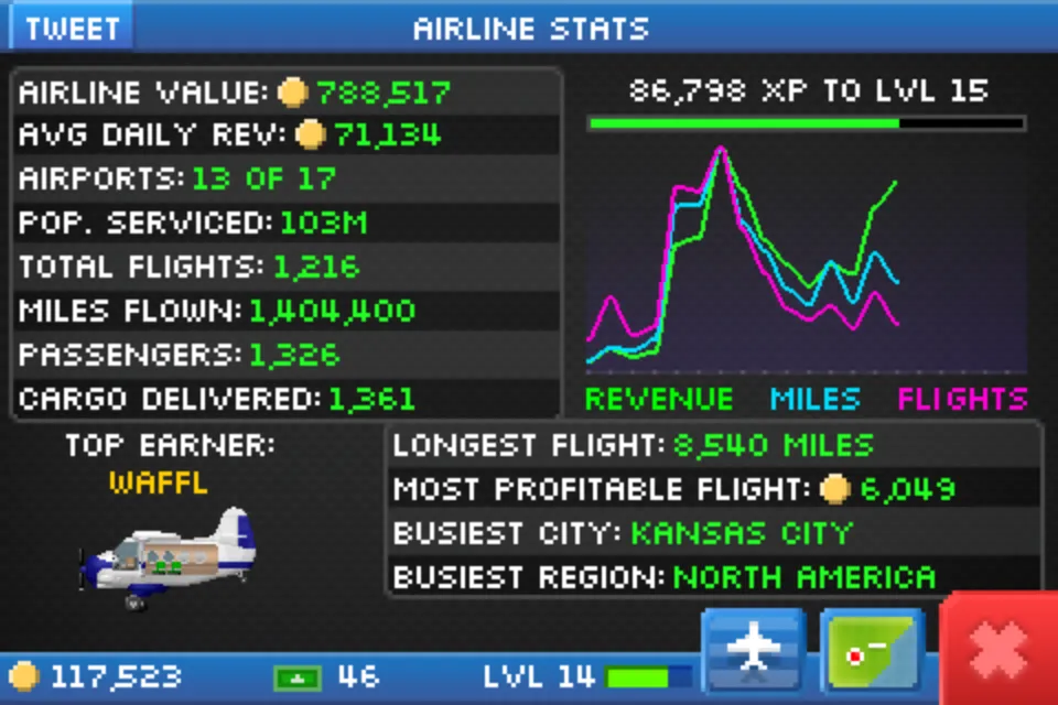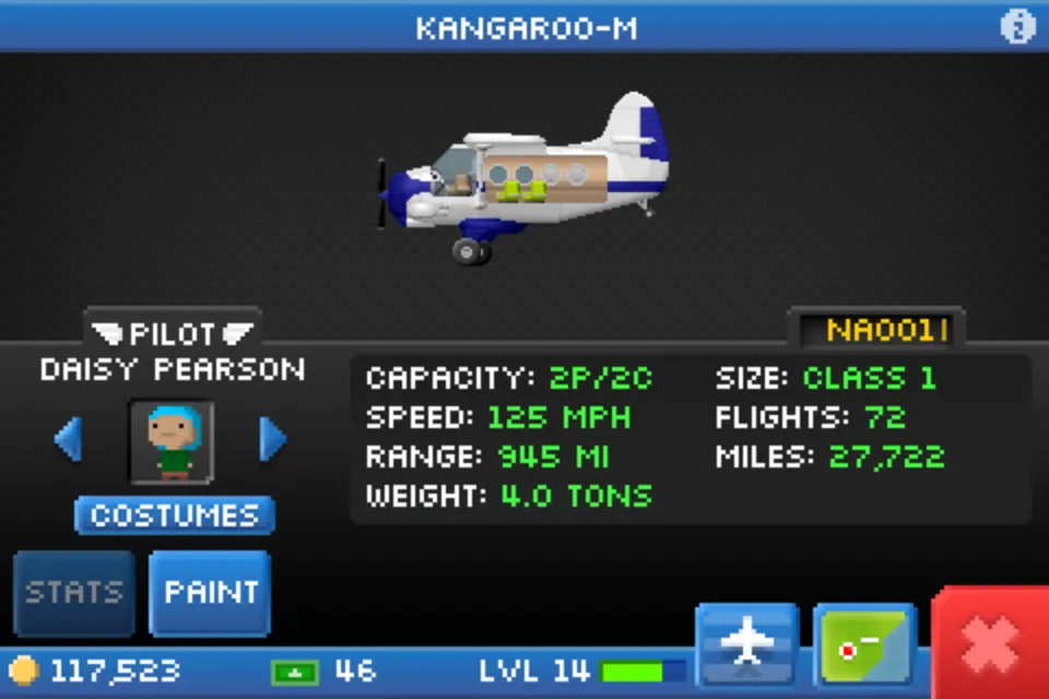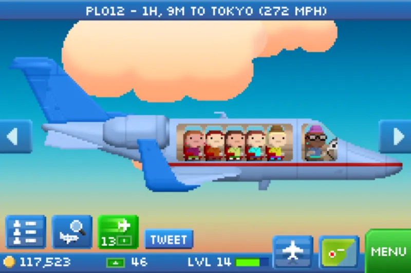 Getting invested in Pocket Planes is easy. When your fledgling airline starts up, results are quick and satisfying. You earn money by loading your customizable fleet of planes with passengers and cargo and then flying to other cities. These trips happen in real time, so you can turn the game off and come back later to reap the rewards (similar to Tiny Tower). You can eventually leave the game unattended for a few hours while waiting for your flights to reach their destinations, but the flights are shorter in the early levels. This gives you a steady stream of experience points, currency, and new planes to use in the expansion of your business.