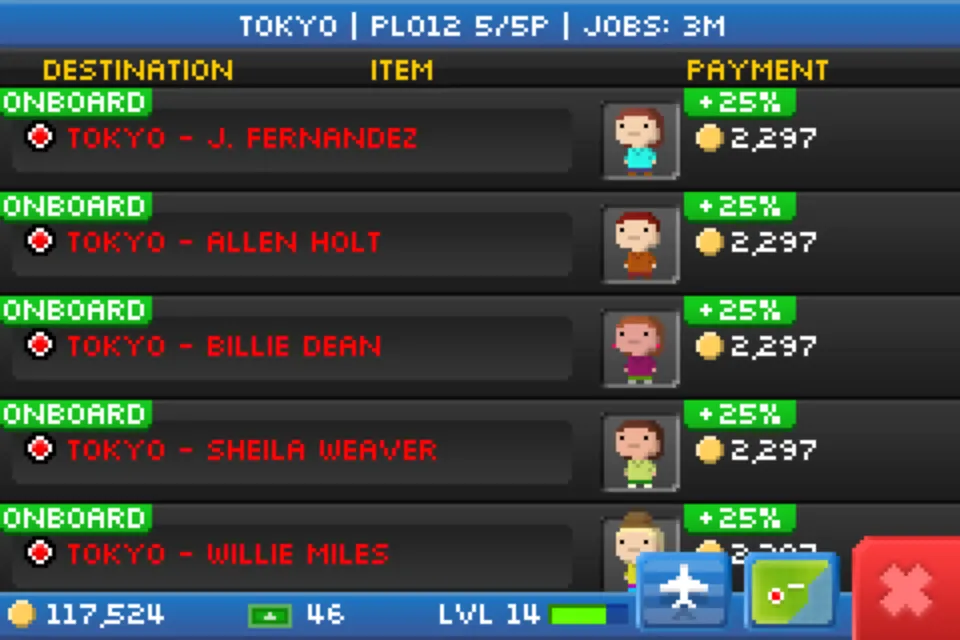 The thrill of opening new airports and earning higher capacity vehicles fuels the opening hours, but the gameplay scales poorly as you advance. Around level 14, upgrading to the “better” planes is a questionable step up; they hold more (and therefore make more money), but filling them to capacity becomes a chore since most airports won’t have enough jobs heading to the same location. Even worse, acquiring more airports just pollutes your finite job list with more potential locations, making it even more difficult to group shipments together.