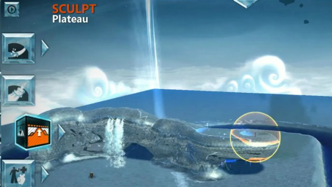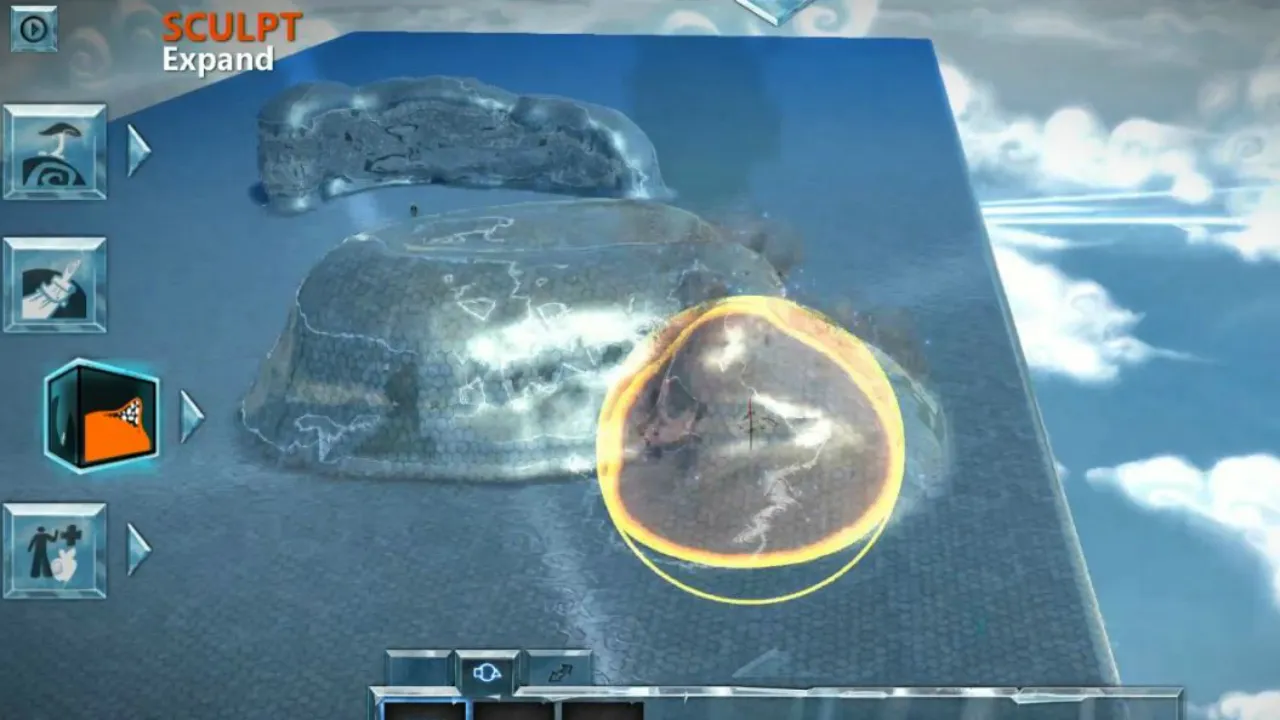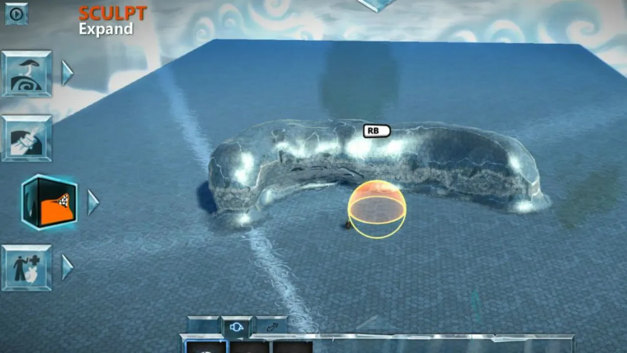 In order to show off the ease of use with a touch screen, the demo is shown using a PC running Windows 8. In this case, a U-shaped landmass is easy to construct because of the intuitiveness of touch screen controls. The demo, however, is shown using a Xbox 360 controller. The silvery mass is created and guided by the orange circular cursor on screen.