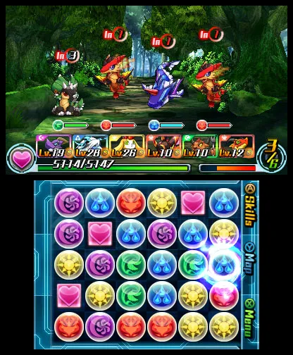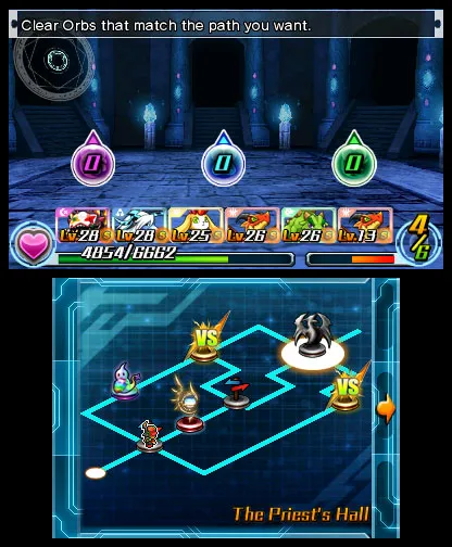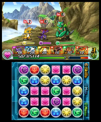 Puzzle & Dragons Z adds a Pokémon-style overworld and a narrative to the original game. Returning players will notice that their favorite collectable beasts are back, but the upgrade system has been tweaked to support the overarching puzzle-piece theme (bad guys are yanking puzzle-piece-shaped chunks of the world off the planet). Defeated enemies drop puzzle pieces of their own, and they’re used to evolve your menagerie in a simple minigame. Defeated foes also drop eggs, which are hatched at your HQ. It’s a little annoying to have to trudge back home to see what they contain, but the ability to fast travel minimizes the hassle.