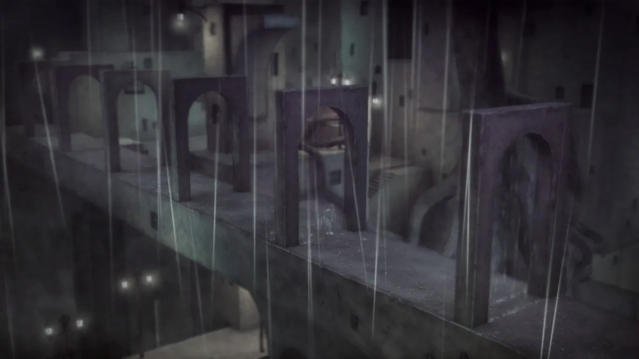 Rain’s story begins with a boy waking in the middle of a rainy night. He dashes outside to help a ghostly girl in the street, and he soon becomes invisible himself and must help the mysterious girl while avoiding similarly invisible monsters. In the rain, all characters look like clear action figures. When out of it, they go completely invisible (except their footprints). Most of the game is a linear path through the city where you hide under shelter, wait for an enemy to pass, and dash to the next hiding spot.
