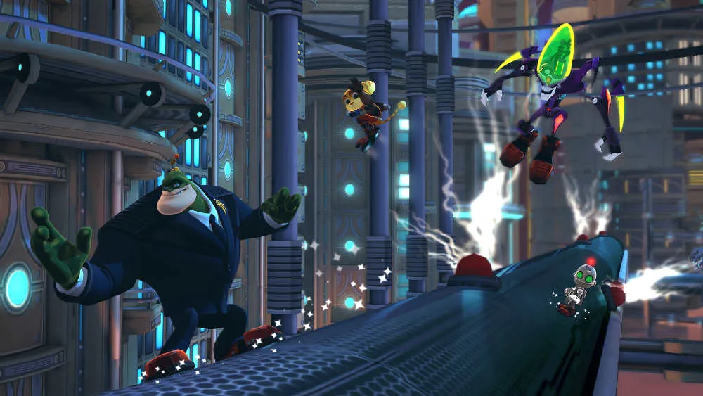 After the gigantic monster bats the taxi out of the sky, the four protagonists land on a big pipe below. In familiar Ratchet & Clank fashion, they proceed to grind on this tube throughout the city. Players dodge electrical fields and fight for position in order to collect all the bolts at the bottom of the grind. This introductory level concludes with the team buying their first weapon, the combustor.