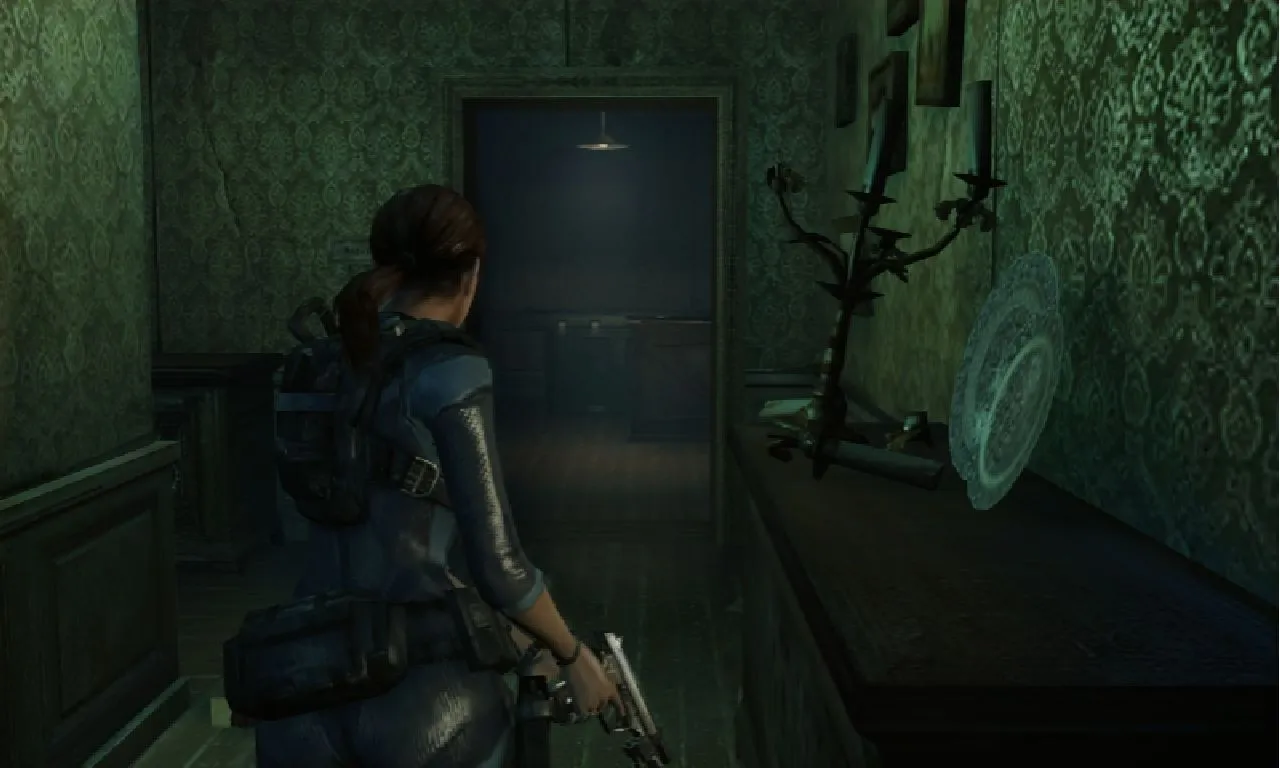 I also explored a big dining hall with half-eaten fare littered about, a main hall with branching paths, and rooms made of still which offered hints that Jill may not be in a strange house. Eventually Jill meets up with her BSAA partner, Parker (Revelations takes place between RE 4 & 5), and they enter what appears to be the bridge of a ship. The ocean churns as Jill and Parker watch a tugboat detach from the huge vessel. Suddenly Jill is apprehended by a strange man with red hair. Parker takes aim as Ms. Valentine struggles. She eventually breaks free of the man’s grasp. The man with the fire red hair appears to know Parker, and the demo ends with the antagonist taking a shot at the duo.