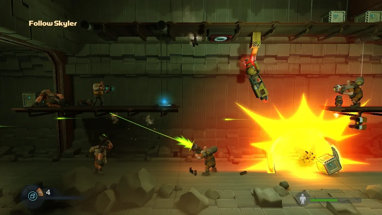 Rochard’s other handy tool is his ability to control the environment’s gravity. At any point in the game, Rochard can turn a rooms gravity down to Moon-like levels. This trick changes Rochard’s approach to puzzle solving in a variety of creative ways. With reduced gravity, not only can Rochard jump higher and survive longer falls, but it extends the firing trajectory of every item he picks up with his G-Lifter, lets Rochard float skyward while standing on air vents, and lets him use the G-Lifter like a grapple hook to swing off bolted objects. I particularly liked jumping through the air in low gravity and then fireing a box downward to give myself a double jump-like boost. Recoil Games shaped a surprising number of puzzles around only a few gameplay elements, and thankfully the mechanics never feel stale.