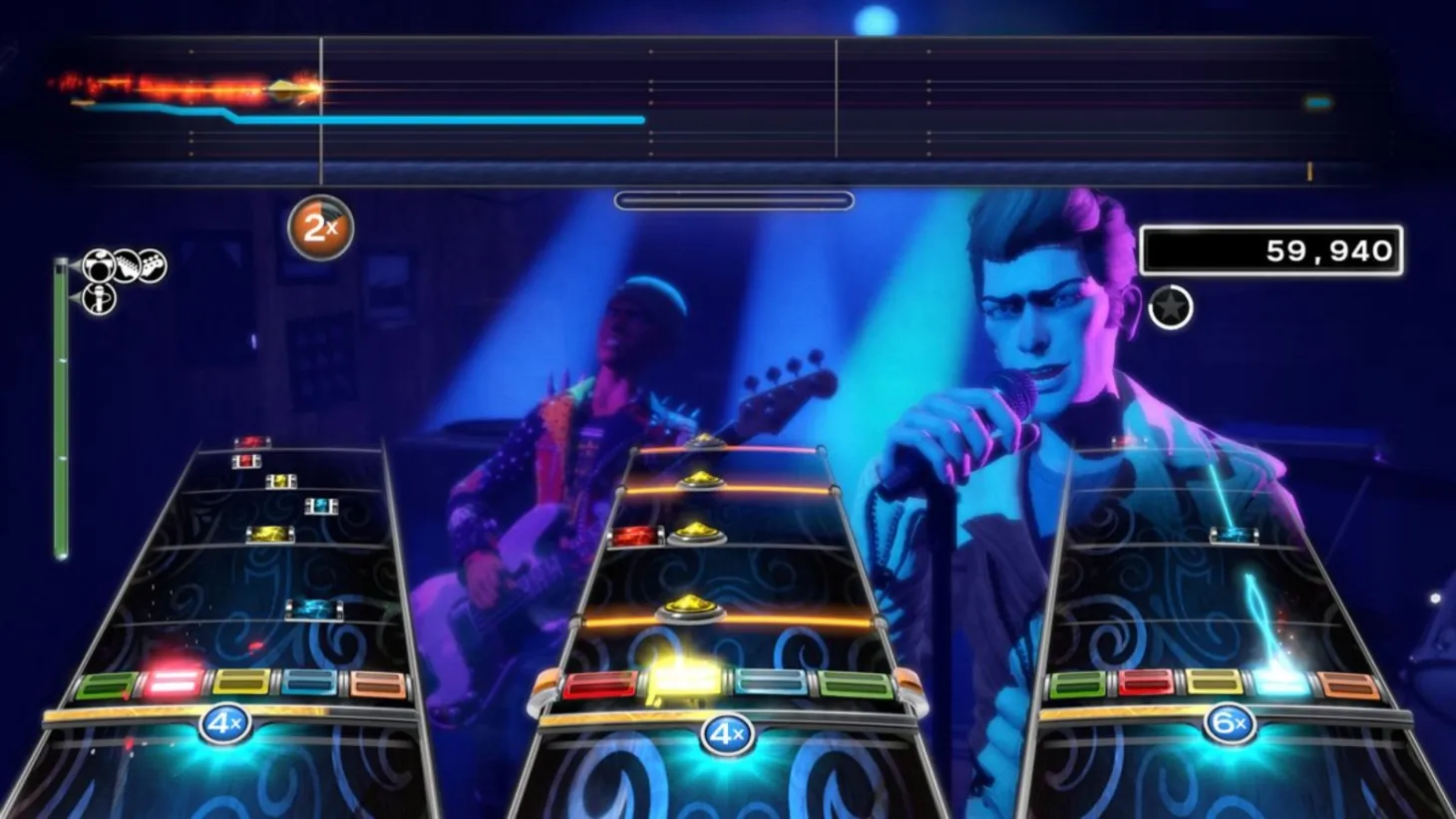 The core gameplay remains unchanged, offering skill-based immersion in great popular music that’s ideal for both solo virtuosos and raucous partygoers. Guitar, bass, drums, and up to three singers can hop into the limelight for a performance, though the vocal lines share a single slot in end-of-song scoring. The familiar scrolling note highways have some flashy new visual effects, but otherwise work as they always have, providing increasingly complex rhythm and color matching. While it’s largely invisible unless you’re watching for it, any given song’s note layout is varied and sophisticated, demanding challenging finger placements on the guitar neck, tough strum patterns, or unpredictable drum fills on the pads all the time.