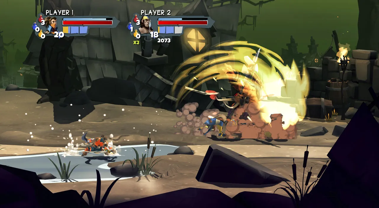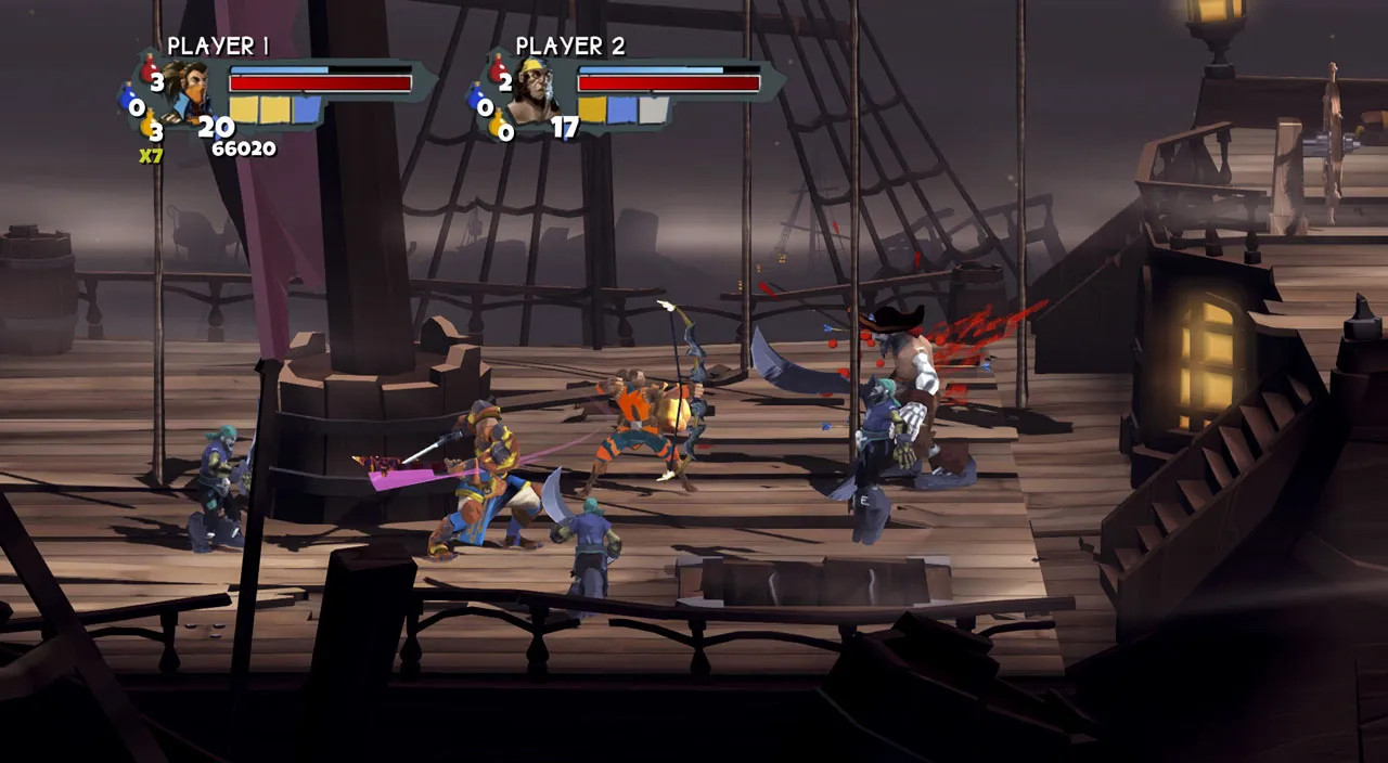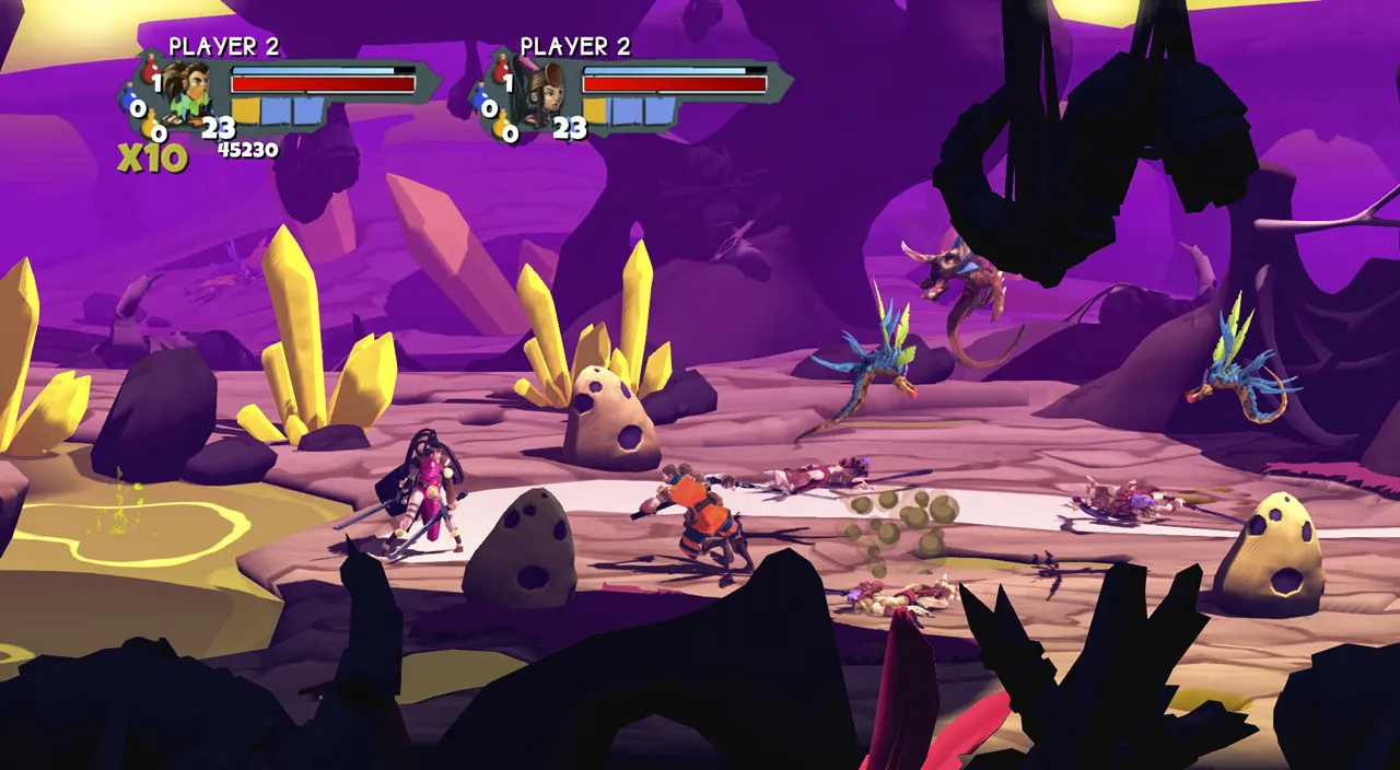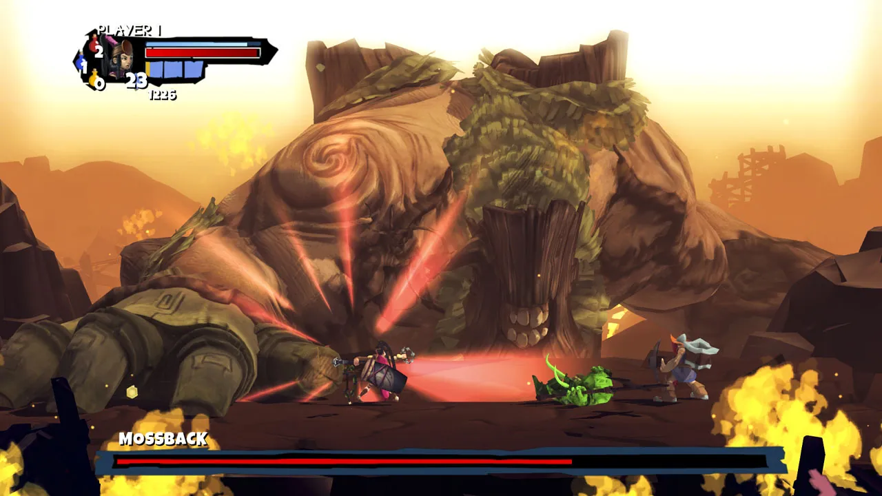Developer Southend Interactive has created a fluid and versatile combat system. Various enemy types push you to change your strategy, and environmental hazards simultaneously present danger and opportunity. Golden Axe fans will enjoy the variety of powerful mounts and environment-clearing super moves that build up over time. A wide mix of tricky mini-bosses and huge screen-filling menaces rain fire from above.
