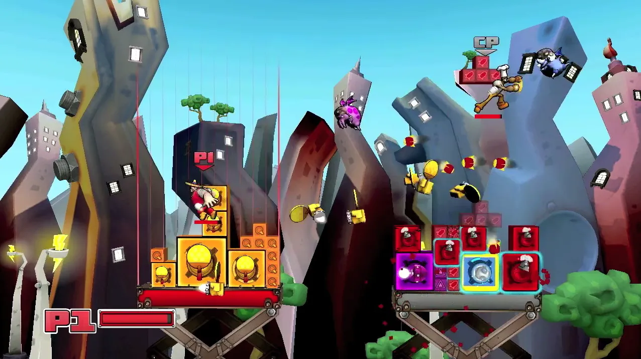 The goal is simple – eliminate the opponent’s tower. To do this, the player must engage in a cyclical process of attacking flying foes that yield colored blocks, which must be reoriented and organized to build up ones tower. Each colored block has a unique offensive or defensive ability, and when augmented to create a larger grid, increase in power. All the while the enemy player can attack you or your tower, steal weapons from under your nose, or repair their structure. To be fair, you can do the same.