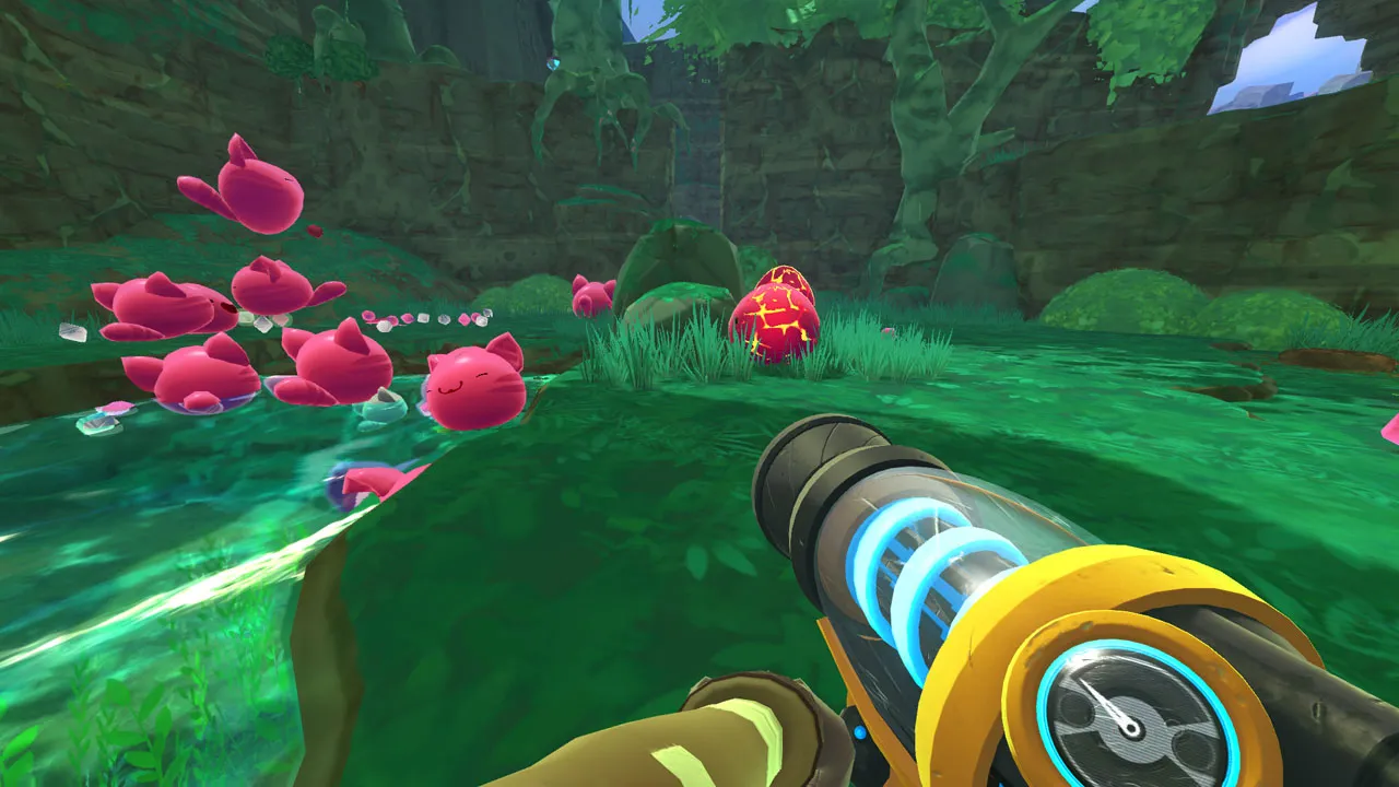 Building a thriving ranch requires going far afield to gather new slimes and resources. You advance through interesting areas, like the quarry and ancient ruins, and the cartoony visual style suits Slime Rancher well. Exploring is fun, and I couldn’t wait to see what unique slimes and vegetation were waiting to be gathered. For example, each slime has a favorite food that makes them produce double the plorts, so bringing that back to the ranch and cultivating it yourself guarantees a big payday. While chasing that payday, sometimes you’re a long way from home, a little lost, and holding on to a treasure trove of rare goodies. Slime Rancher nails the thrill of that situation, creating memorable moments of tension and discovery without being too punishing.