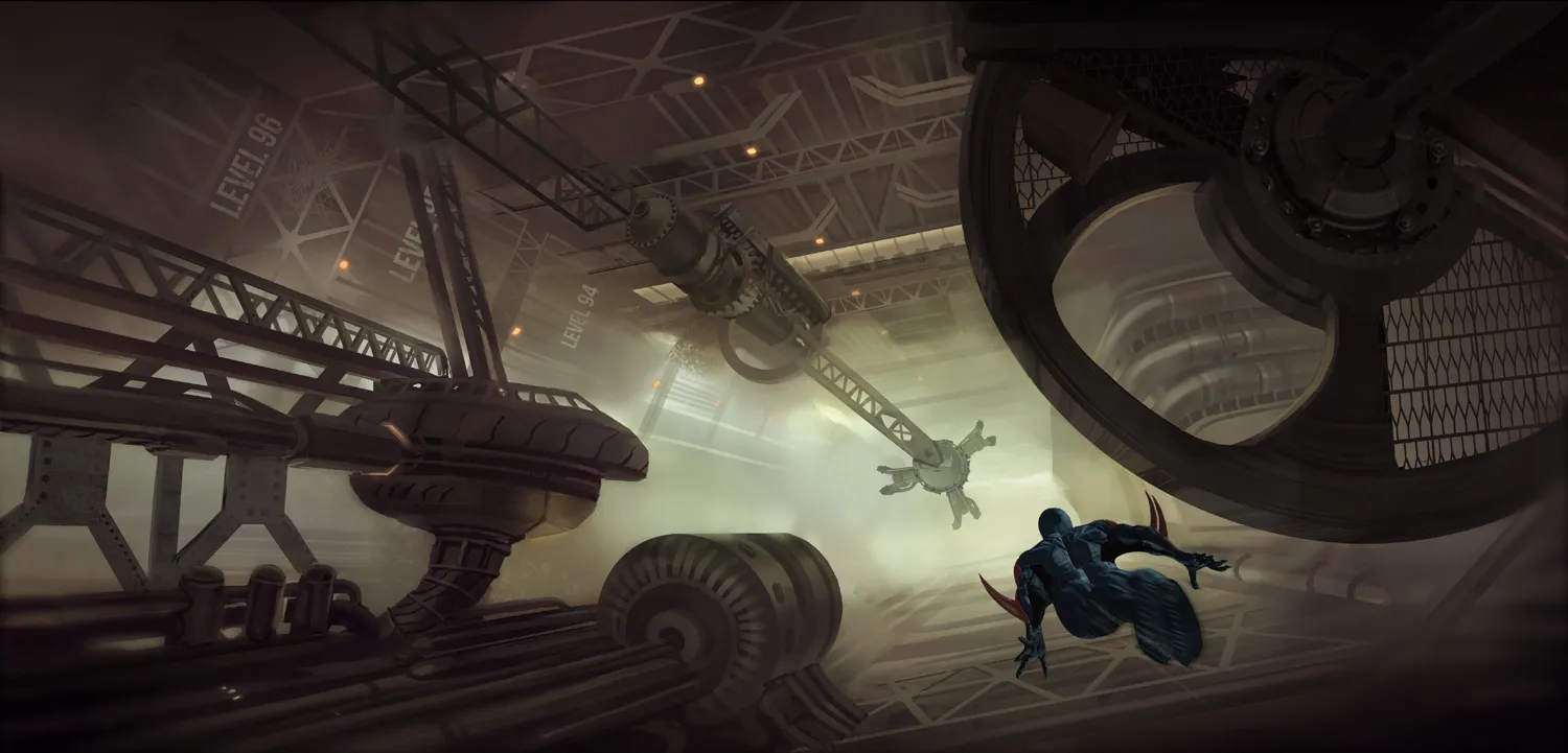 When players take control of Spider-Man 2099 they’re forced to deal with the repercussions of this quantum causality phenomenon. “Sometimes a wall might disappear right in front of you while you’re playing because of something that has changed in the past,” Lehiany says. “While you’re playing, things are constantly evolving around you, so you’ll have to always be reactive.”