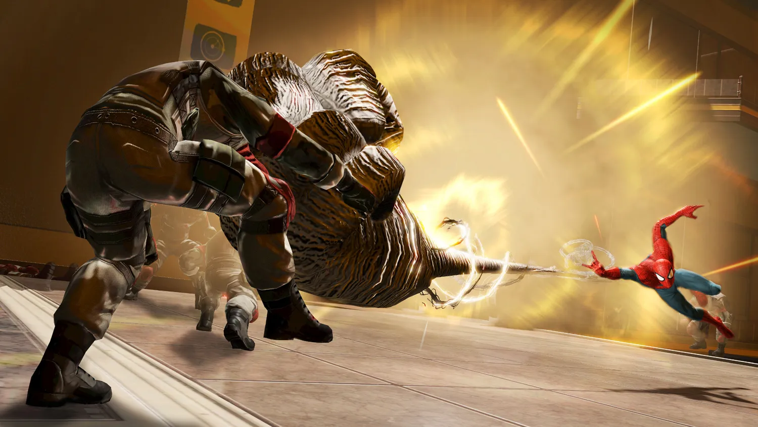 At one point in the game, Peter is sneaking his way through the halls of Alchemax when he receives a message from Miguel. A towering security mech has overcome the future hero, but if Peter makes his way to the lab and destroys the blueprints for this security bot, the robot will cease to exist in the future and he’ll save his counterpart.