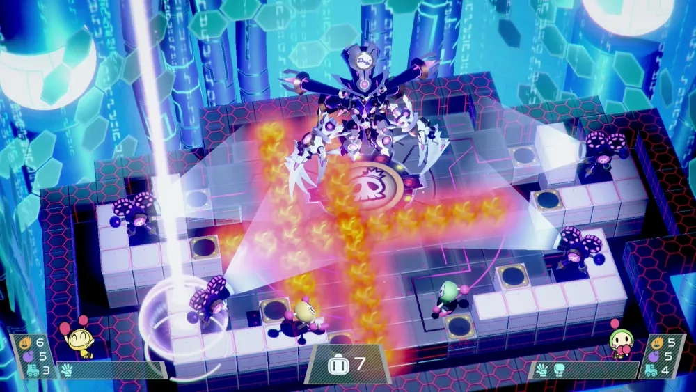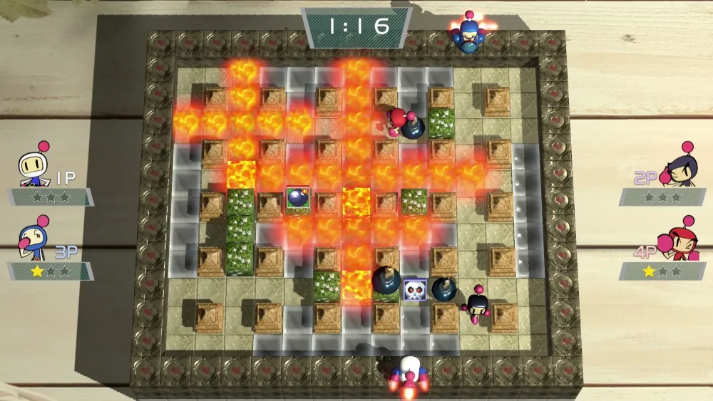 When you're playing locally, you have the option to add human or computer opponents. Playing with the latter often feels broken, as the A.I. runs instant calculations and knows exactly where to place its character the way an expert player would, and you can't tune the difficulty to be more in line with the other players in the match. Unless you're in a match full of skilled Bomberman players, you're probably better off leaving those extra spaces blank.
