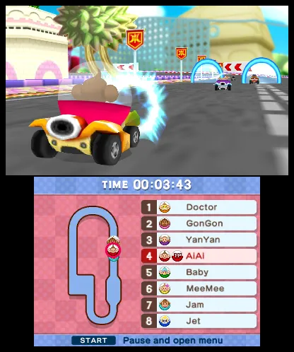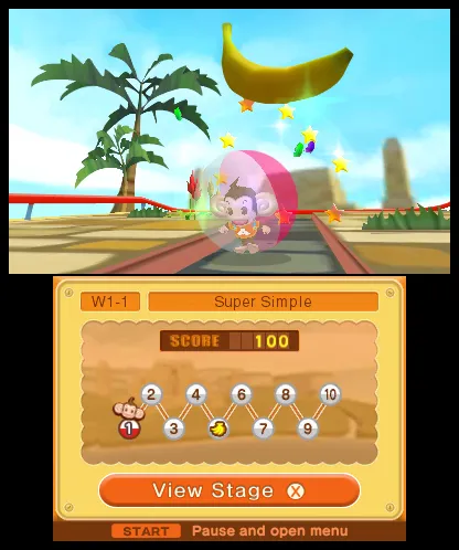 Speaking of nausea, Monkey Ball 3D’s three-dimensional effects probably won’t upset your stomach. That’s probably because they’re so unremarkable that you’ll turn them off immediately. Bananas occasionally fly at the screen, dirt is sometimes kicked into your face, and the monkey ball pops out from the game world. Super Monkey Ball 3D is a poor demonstration of the unit’s immersive 3D tech.