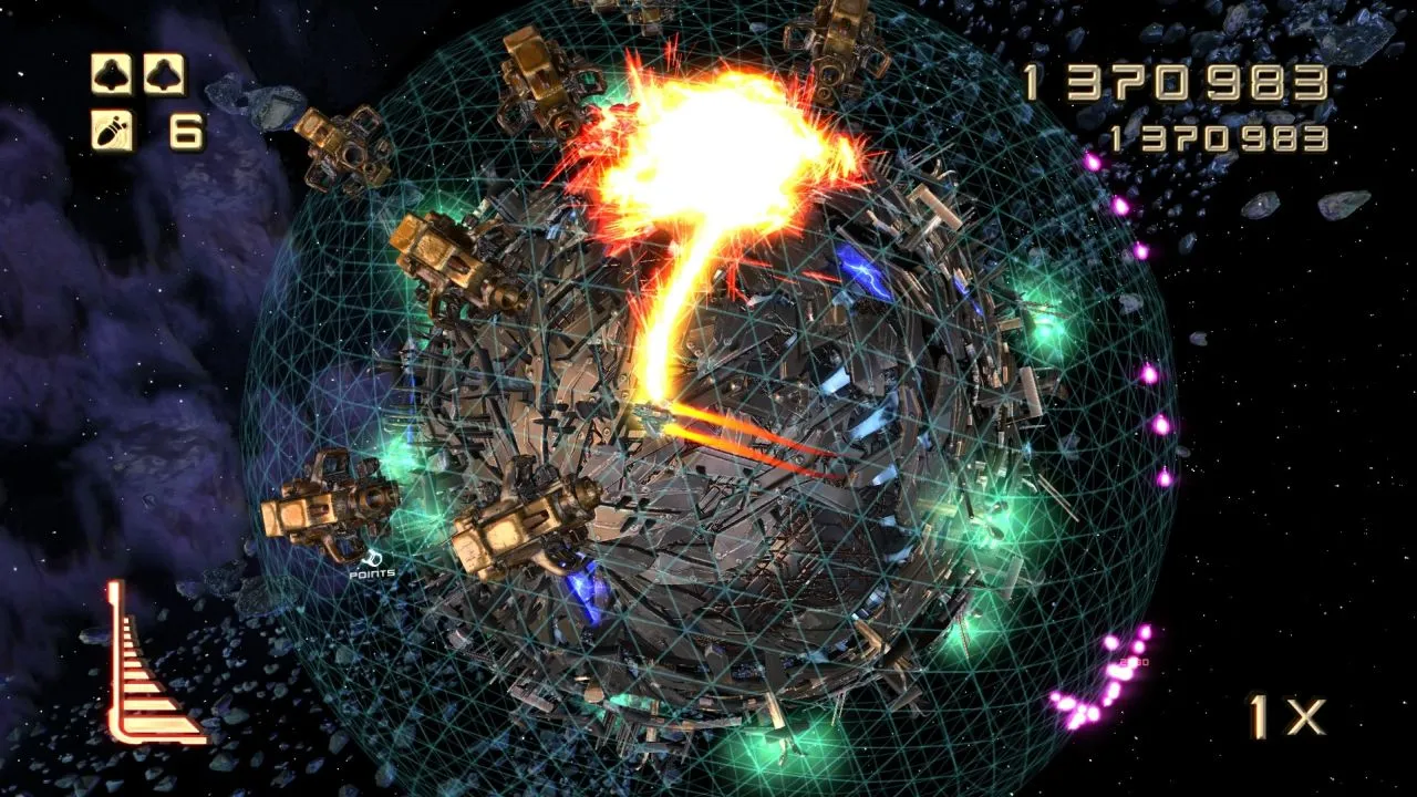 Battles are intense, and the constant colorful explosions and effects lead to the same eye fatigue they always have. The visual splendor is impressive, but sometimes particularly vibrant explosions block one’s view of the action, which is a big problem in a game that requires this level of precision. The addition of optional stereoscopic 3D is another visual wow factor, but again, I’m not convinced that it helps with the already overwhelming visual confusion. While different enemy and asteroid colors change the ideal weapon to use, there’s too little variety in the way those enemies attack and move to maintain interest across multiple levels. The challenge comes simply from having more things onscreen, and rarely from more challenging patterns of attack. Planet-ending bosses are repeated across levels, with the only major change being that you have a second twin of the boss to confront in later battles.
