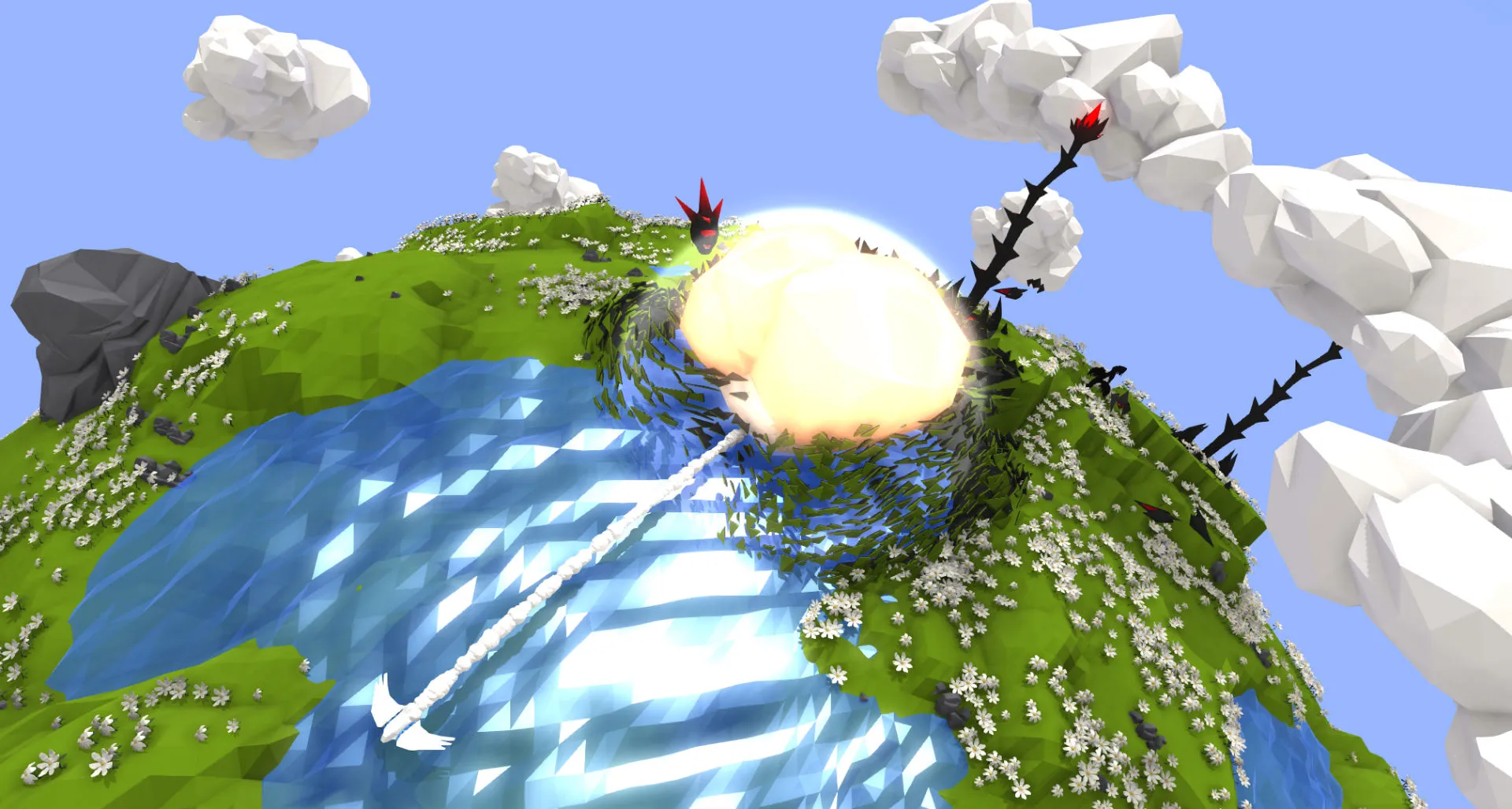 Each planet features weather, a day-night cycle, living vegetation, and environments that can be both molded and destroyed by the player. Music is the number one way to interact with the world; playing a calming classical song will sprout a forest, while playing aggressive heavy metal music is perfect to get out of a dangerous situation.