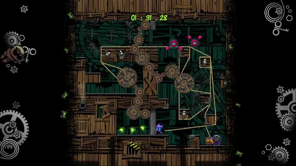 Some rooms give you full control of room rotation, allowing Shuggy to run on walls and ceilings. Other times you must guide little orange creatures to free caged gems, outrun a spike ball chasing you down a corridor, or wind a magic rope around several gears to open the path ahead. In a nod to P.B. Winterbottom, another game type records you and automatically sends out a clone that mimics your movements. The twist? The clones will kill you if you touch them.
