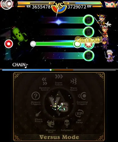 Players can also compete online or locally in a head-to-head Versus Mode, which is unlocked after trying all the other modes. Two songsters simultaneously battle a variety of monsters, duking it out for the high score to win useless collectable cards. Performing well fires random status effects at your enemies (similar to boss battles in Guitar Hero III), like a faster highway, stricter timing windows, etc. It's a simple, fun way to enjoy the game with your friends, even if the collectable cards aren't the greatest motivator.