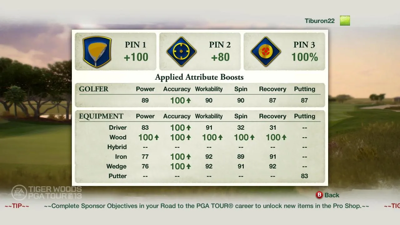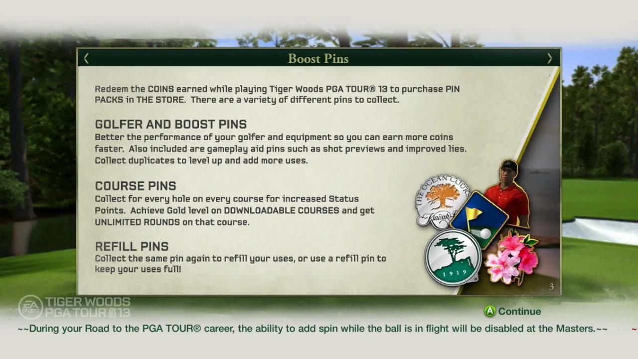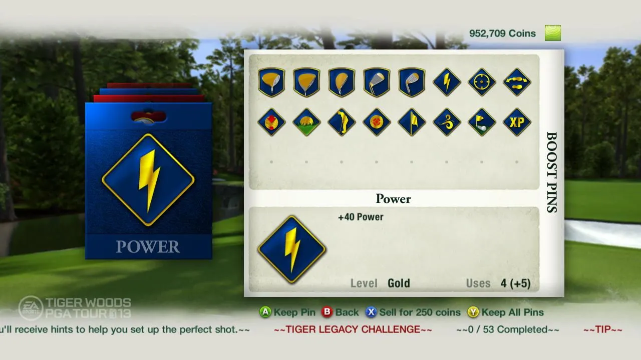 - Redeem coins you've earned in the game for pin packs. These can be equipped to boost your abilities. There are all kinds of different pins in the game, including boost pins (which might give you something like +40 accuracy, etc.), golfer pins (an across-the-board boost for that golfer if you use them), and course pins (which increase the amount of status you earn for that course as applicable to your online country club)