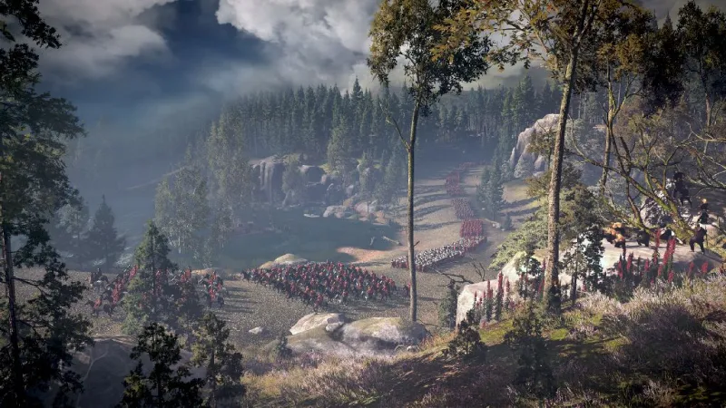 Nearly a decade has past since the last time Creative Assembly built a game in this historical period, and in the passing time the studio has constantly iterated on its signature combination of sweeping grand campaigns and intense real-time battles featuring thousands of soldiers. Rome II features battlefields spanning 2 x 2 square kilometers with more varied elevation than we've seen in the past. In the Battle at Teutoberg Forest, the Germanic tribes are stationed on ridges overlooking the tactically susceptible forest pass. As the Roman legions march through the forest, suddenly flaming boulders start rolling down the hillsides toward them.