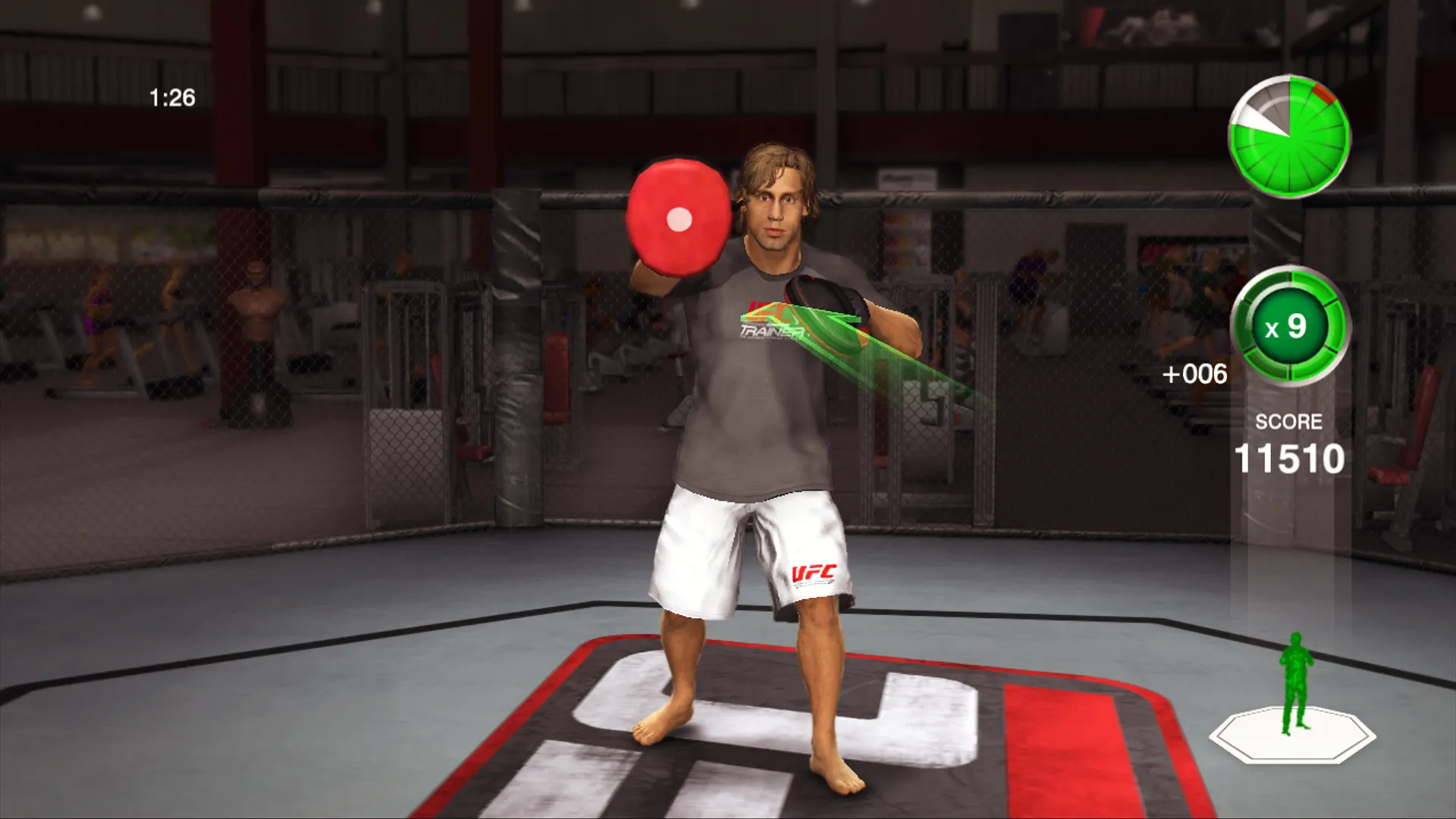 The title was initially designed for the Wii, but further on in development a decision was made to release the game on PlayStation 3 as well as Xbox 360. With Kinect-exclusive features including voice commands and additional workouts, THQ says the 360 version is the optimal version. During a demo with the Kinect version of UFC Personal Trainer it was clear the team took great care with the menu system. Both voice controls and voice gestures were very responsive as I worked through the polished interface. I was also able to try out a bit of kickboxing where I followed green arrow prompts to punch and kick a punching bag, and though the moves were simple, it definitely got my heart pumping.