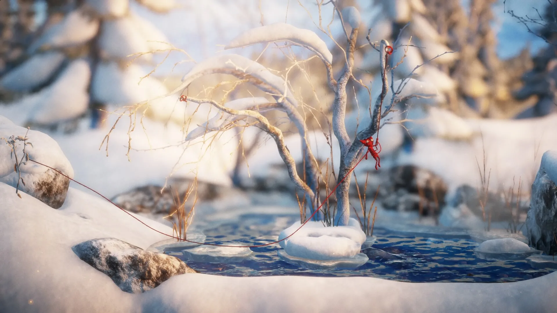 Unfortunately, the sense of discovery and awe is fleeting. While each level takes you through a different chapter in the elderly woman's life (with new settings, emotional themes, and obstacles), your solutions are always the same. You continually roll around rocks, apples, and snowballs to hop over high ledges, and slide objects up and down your constructed yarn bridges – usually to also hop over high ledges. None of Unravel's puzzles are particularly challenging; the few times I got stuck it was from overthinking the problem at hand.