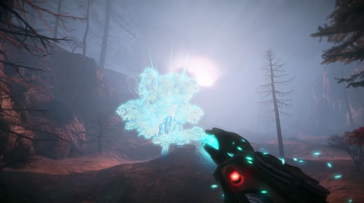 After emerging from the cave, the music swells to show off a vast, mountainous valley. Birds fly overhead, the trees sway gently in the breeze, and sun-drenched waves on the lake glisten; it’s a beautiful moment that quickly turns alien as your character stumbles upon a herd of friendly glowing specters with antlers frolicking in the field. They lead you to a crate containing an item called the L.E.A.F. suit, a device created for soldiers. The suit is an exoskeleton that straps to your arms and legs, and grants super speed, high jumps, and the power to manipulate life and death. That third power, as ominous as it sounds, is jokingly introduced in a black-and-white video, then isn’t touched on again for a while. However, it instantly makes a colorful and peaceful experience look like it’s going to have a dark and disturbing side.