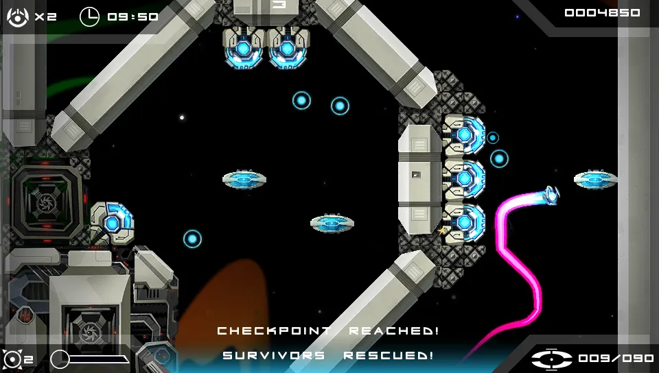As is typical in vertical scrolling shooters, the screen is constantly moving ahead of the player. The action doesn’t pause or slow down when you use the button to transport, which can be a problem since your ship can’t move while you’re trying to aim your teleporter. The touch-screen method is faster, but requires that you take one of your hands off the controls, which is never a good idea in a shooter. Thankfully, the design of the main levels never place you a in a position where you have to transport repeatedly with speed. My lack of confidence with the teleportation mechanic never caused frustration; it’s not a perfect system, but it’s good enough for what the action demands.