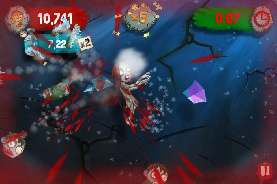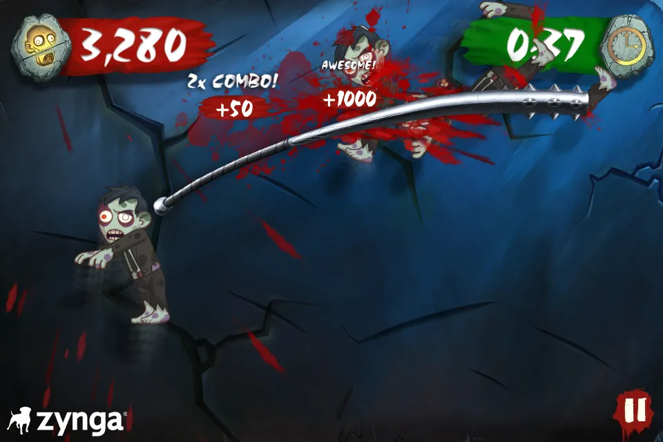 Players have 75 seconds to swipe zombies as they fly through the air, collect coins, and avoid slashing the living. You have access to weapons like swords, machetes, and baseball bats, with fancier and more powerful versions of each unlockable as you progress. Weapons are actually rendered onscreen, so instead of just seeing a colored line swipe through the zombies, you’ll see your weapon slice through the air.