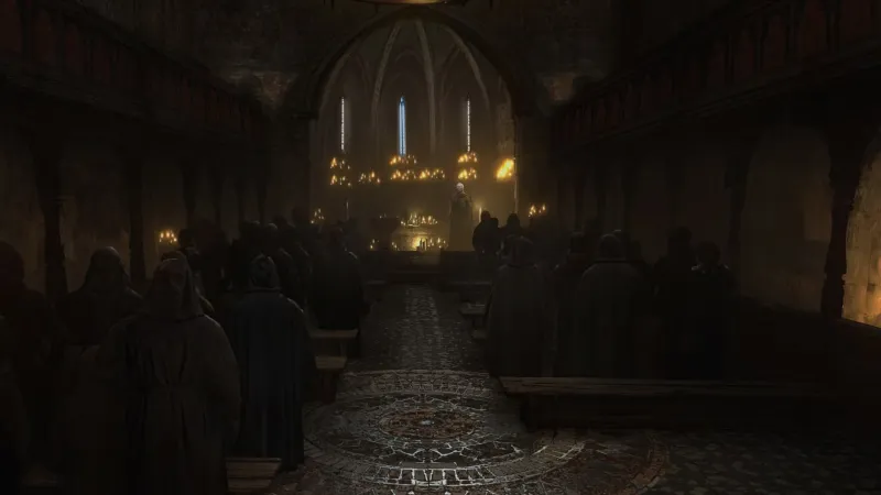 Coen infiltrates a cathedral and sticks to the upper floors as, down below, a blood ritual is happening. He uses Plane Shift to walk on walls and ceilings like Spider-Man, albeit on two feet. He also utilizes Shadowstep, which allows him to teleport short distances by transforming into a moving shadow. In the cathedral, he searches nearby Frescoes painted on the ceiling, looking for a clue as to the whereabouts of St. Mihia's crypt, which houses a sword he's after.